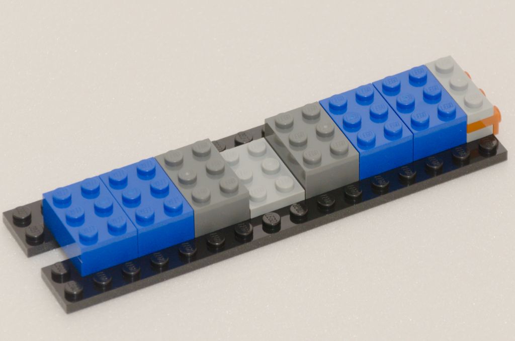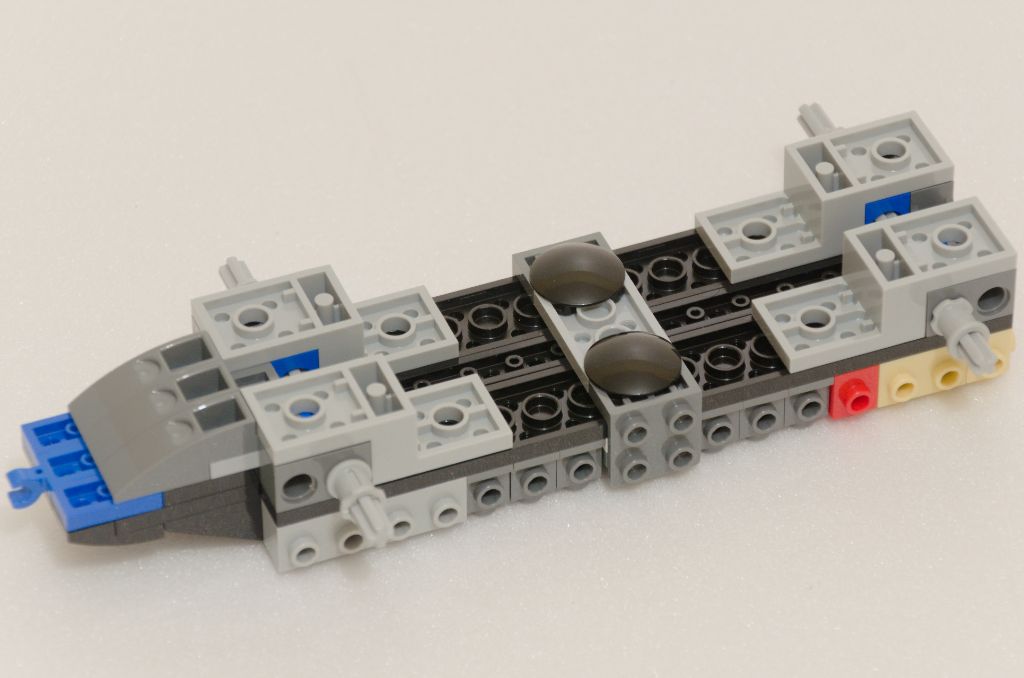 Le plancher est d’abord constitué par l’assemblage de briques de bonne taille permettant de rigidifier la longueur finale qui atteindra la vingtaine de tenons. S’ensuit alors la même logique de renforcement du soubassement et un début de prise de hauteur pour installer les futures roues.