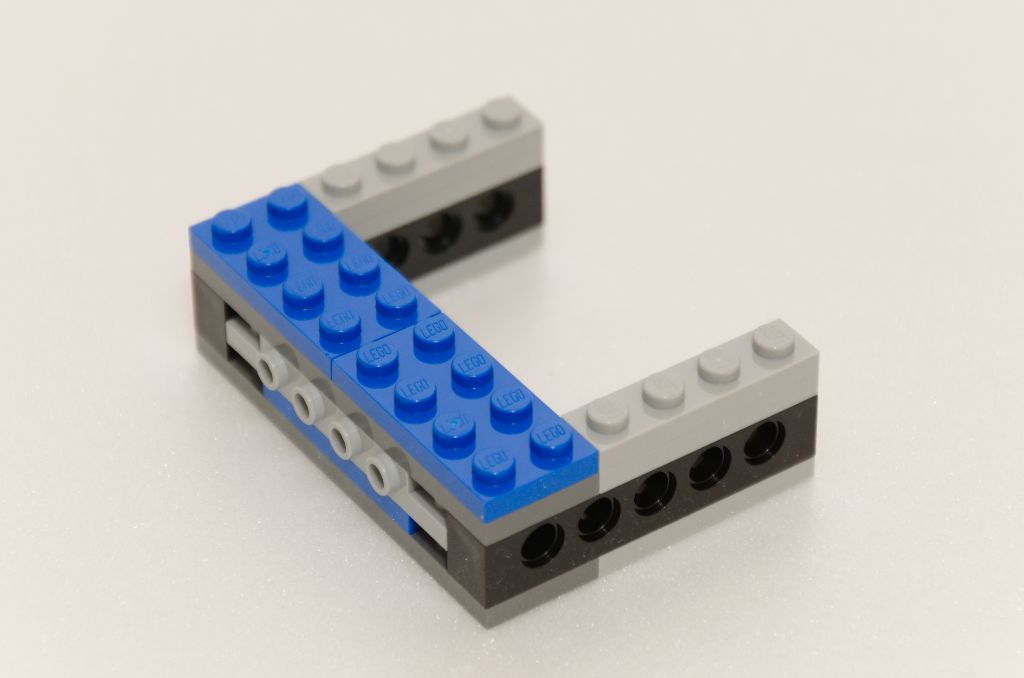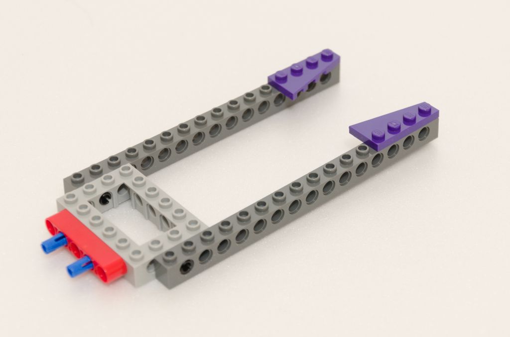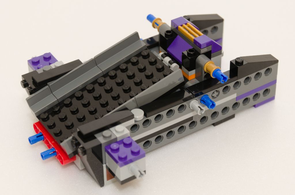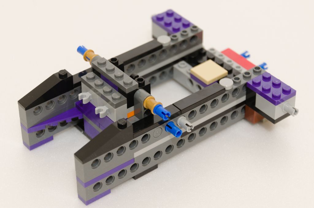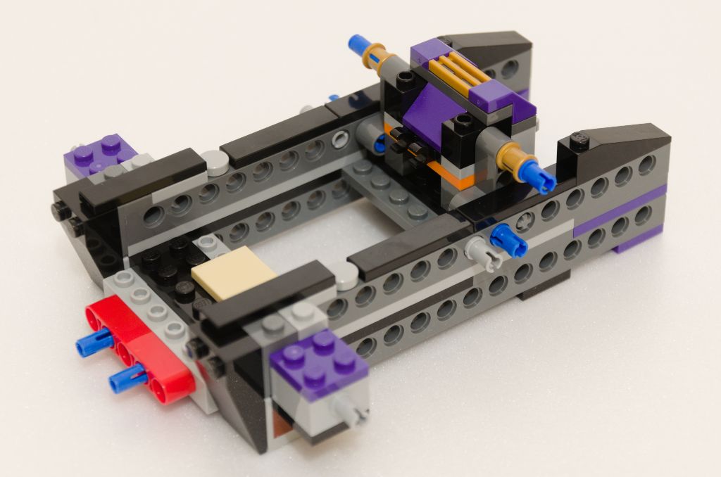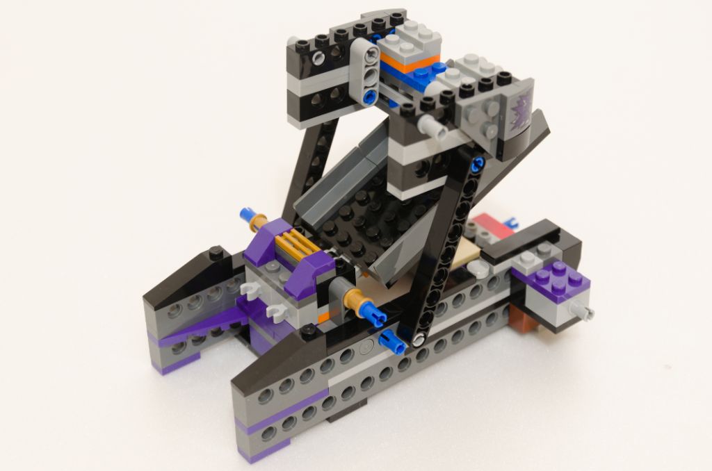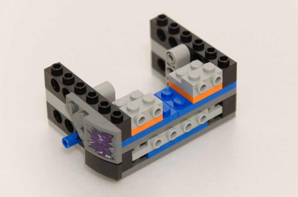 La suite est un peu sur le même principe que pour construire une benne de pick-up ou une plate-forme mobile de dépanneuse. Je m’explique, nous ajoutons une couche de pièces SNOT noires pour lisser les bords. Ensuite la structure qui permet de basculer les nacelles est mise en place avec cette fois un peu plus de couleur (violet) et toujours maintenu à l’ensemble par des pièces Technic. Enfin, la plate-forme de lancement des tonneaux est ajoutée.