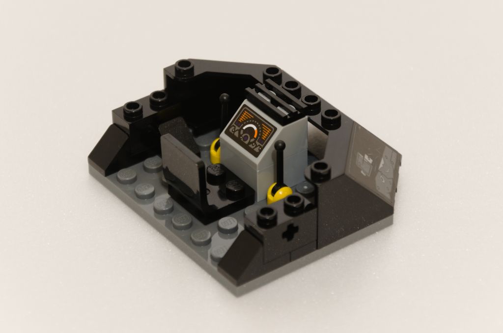 Grâce (encore) à des pièces Technic, la nacelle de pilotage est ajoutée à la plate-forme des tonneaux. S’en suit un autre sous-ensemble pour faire le poste de pilotage à part entière. Assez classique mais efficace, siège noir, deux manettes de pilotage, un cadran et des bords inclinés décorés à grand coup d’autocollants.