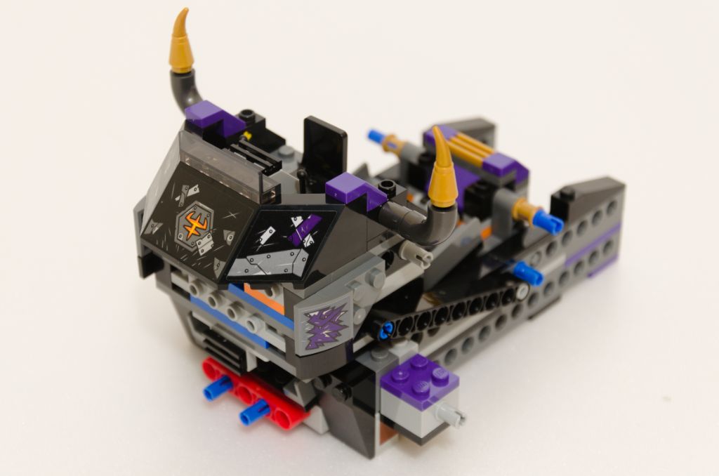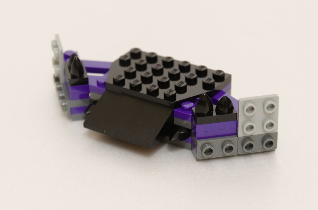 Le début de l’assemblage se fait par un sous-ensemble et une plate de 8 tenons qui nous indiquera la largeur de la tête du taureau. Là aussi, entre les pièces classiques nous ajoutons beaucoup de pièces Technic, le tout maintenu avec des pins bleus. Encore une fois, deux couches de Technic et deux couches de plates classiques, c’est du solide tout ça. Petites décorations latérales avec de nouveaux autocollants qui là aussi ajoutent une pointe de violet dans tout ce gris et noir.