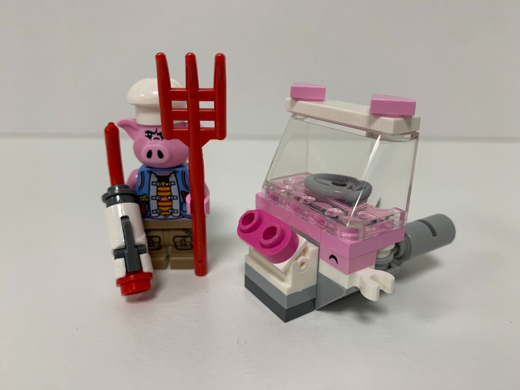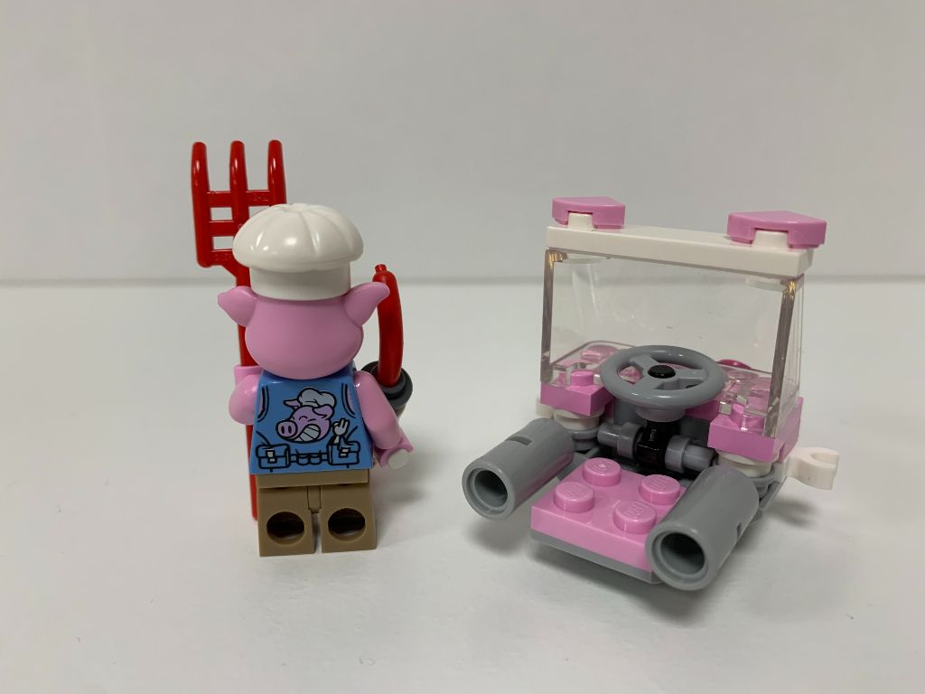 On obtient le « cochon » Pigsy. C’est une minifig aboutie, belle tête moulée, torse doublement tampographiés, mini jambes tampographiées et articulés (ça c’est cool par rapport à toutes ces mini jambes fixes que l’on retrouve dans l’immense majorité des cas). Le personnage est équipée d’une fourche et de son lanceur-saucisse.