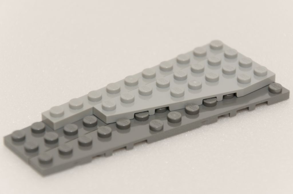 Comme souvent pour un véhicule assez conséquent (presque 23 cm de long), le châssis est composé de pièces technic permettant de solidifier l’ensemble. Une fois le châssis fait, le plancher donnant un peu de largeur est posé avec deux plates de 4*8. Nouvelle grande plate pour fixer le tout, nous retournons l’ensemble pour y poser … des roues. Eh oui, le bateau ne flotte pas mais il roule et pour la jouabilité, c’est très bien trouvé. La structure est ensuite agrémentée, de huit éléments d’angle qui supporteront les flotteurs latéraux.