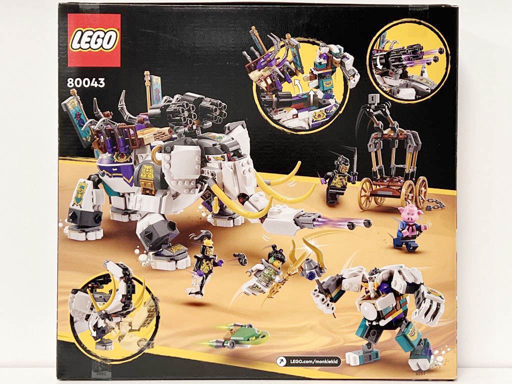 En face avant, Yellow Tusk Elephant chevauche son pachyderme accompagné de l’Ink Demon et tractant un carrosse avec une cage dans laquelle est enfermé Pigsy. Mei sur son hoverboard affronte directement l’Ink General. En bas à gauche le visuel présente l’arme à collectionner dans cette série de sets issue de la saison 4. Sur le dos de la boite, Pigsy s’est échappé mais est sous le feu de l’éléphant qui tire par sa trompe. En vignettes, on voit les autres systèmes rotatifs de tirs et l’extraction du poste de pilotage. Ce dernier se transforme en mecha piloté par Yellow Tusk Elephant pour combattre Mei sautant de son engin.