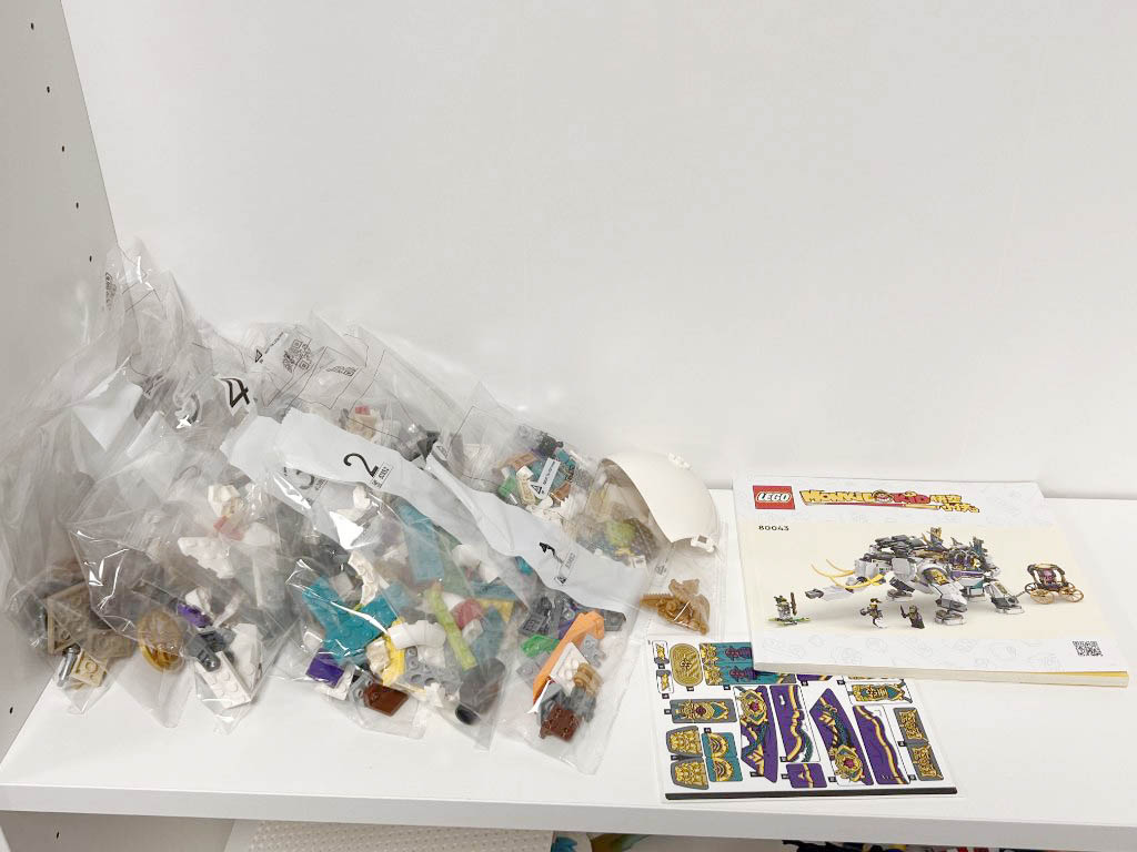 A l’intérieur, on a 9 sachets plastiques numérotés de 1 à 8 plus un de pièces spécifiques aux armes, une métapièce et un sachet papier enfermant la notice de 191 pages et la planche de 23 stickers. Pour celles et ceux que ça intéressent, la notice est aussi disponible en version 3D sur l’appli LEGO Builder.