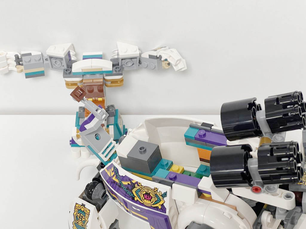 La jouabilité est au rendez-vous, le pachyderme a trois lanceurs et un mecha extractible, il y a le carrosse prison. Certes Mei avec son seul hoverboard semble un peu en difficulté mais en associant ce set avec d’autres de la gamme voire des NINJAGO (car j’imagine bien l’affrontement avec un dragon) on obtient ce qu’il faut en terme d’amusement. On peut regretter le faible grip du mecha qui tient par un seul tenon dans le dos de l’animal, avant d’être en partie couvert par la nacelle. Mais les constructions sont solides dans l’ensemble.