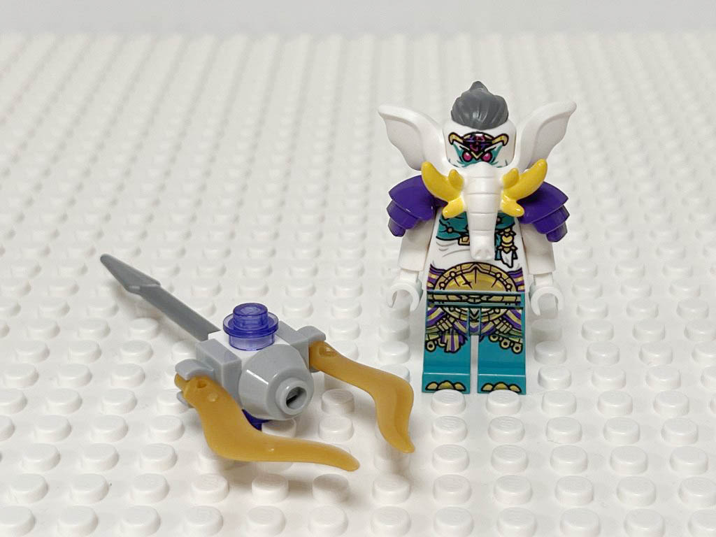 Enfin Yellow Tusk Elephant a une grosse arme brickbuilt. La figurine est constituée d’un élément spécifique trompe-défenses-oreilles. Les tampographies sur fond blanc du torse et de la tête s’accordent facilement avec celles des jambes. Ce personnage est franchement réussi également.