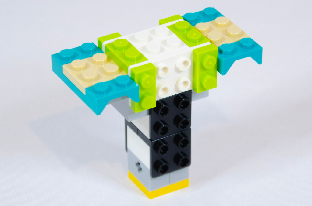Une fois les deux parties reliées, nous passons aux jambes. Le but étant d’avoir une minifigurine et la symétrie étant de mise, nous ferons donc tout en “pareil mais pas pareil”. Construire les jambes consiste à empiler des briques vertes afin de faire la combinaison du pilote. Un joli trait vert sombre ressort au fur et à mesure et vient casser un peu cette masse verte claire afin de reposer l’œil et, sûrement de symboliser la couture du bas de la combinaison.