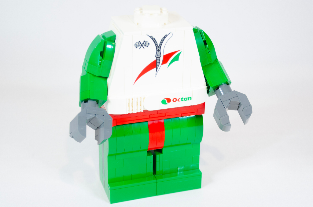 Des pans obliques viennent fermer sur les côtés et deux axes technic dépassent pour laisser l’implantation des bras. Le tout est ensuite fermé par deux pièces servant à faire les murs des bâtiments. Une entièrement blanche et la plus intéressante, celle tampographiée, représentant la combinaison de notre pilote. L’impression est nette et la taille permet d’avoir de jolis détails sur les drapeaux à damiers et la fermeture éclair. Le tronc se termine par la mise en place de la ceinture sur le tronc, avec la pose du logo Octan, lui aussi très bien réalisé.