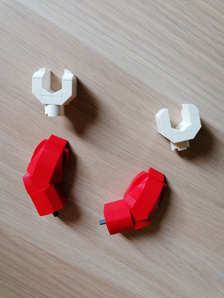 Le sachet 4 est dédié aux bras en rouge et aux mains blanches. Le tout peut bouger sauf les coudes bloqués par une hinge plate 1×4. Cette liberté de mouvement est bloquée comme sur une minifig. La similarité est vraiment respectée, tout comme le décrochement sur la partie basse de la main.