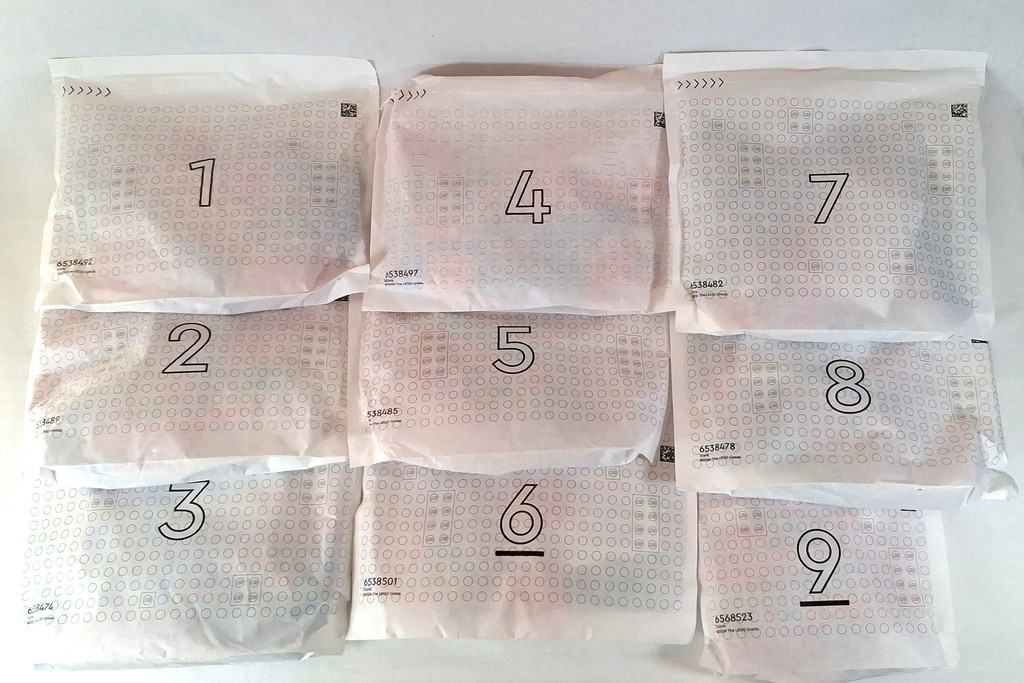 A l’intérieur on trouve neuf sachets papiers et deux notices. On pourra donc partager à deux la construction avec deux lettres pour chacun. L’inventaire est assez étonnant ! On a essentiellement des briques et des plaques dans les couleurs les plus classiques : bright blue, bright red et dark green. On a bien quelques connecteurs et autres rares éléments spécifiques, parfois nouveaux dans ces coloris, mais c’est tout. Ni autocollants, ni tampographie non plus. La liste complète est disponible ici.