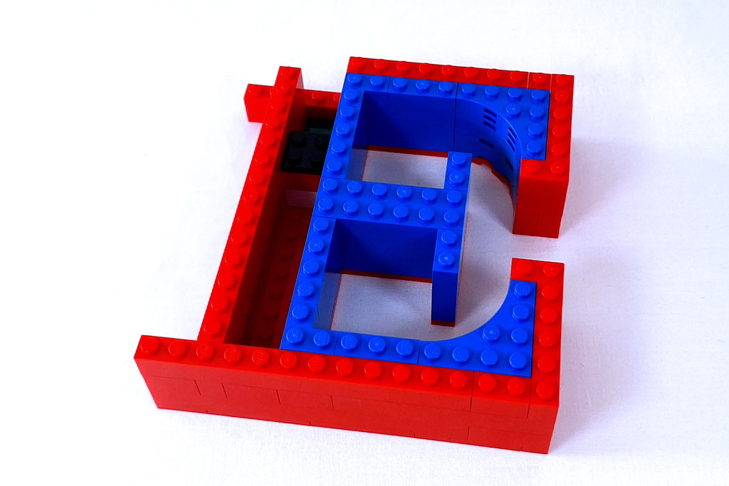 Le O est la lettre la plus intéressante avec quelques techniques. Elle suit le même schéma que les autres pour la partie centrale avec du SNOT et des clips sur les côtés. Ceux-ci accueilleront quatre sous-ensembles pour fermer le O en lui donnant sa forme oblongue. La petite béquille à la base ne sert pas à en faire secrètement un Q, mais à le fixer dans le trou qui se trouve au dessus du E avec là aussi des connecteurs.