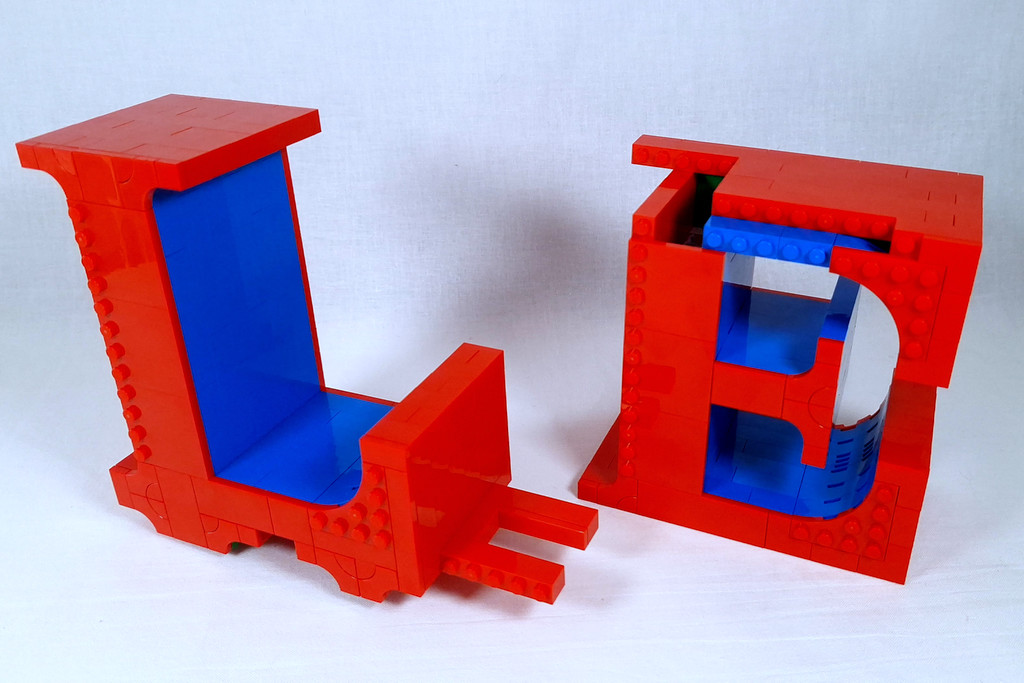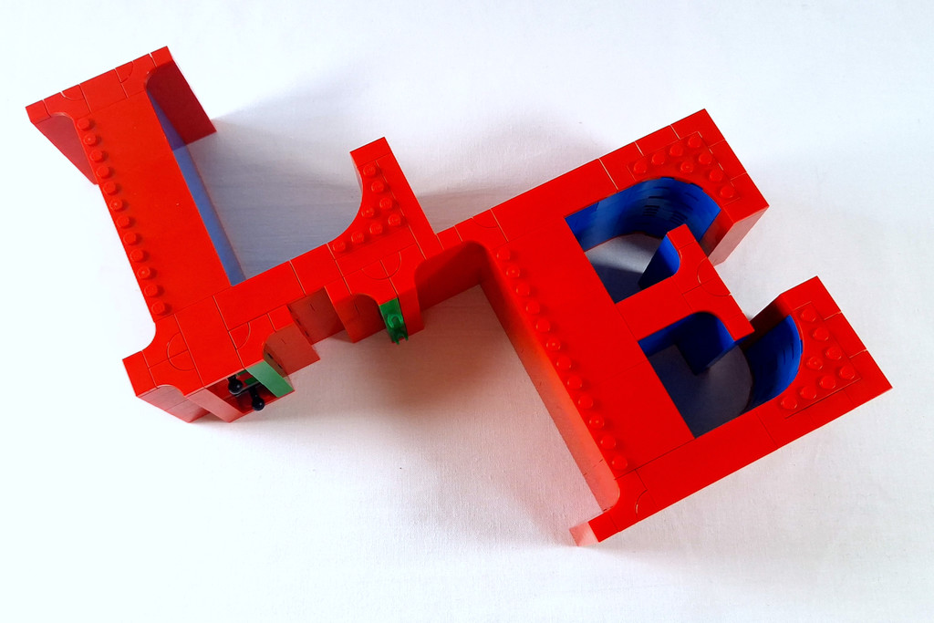 Les lettres suivent le même schéma : on reproduit la forme de chaque lettre par une base en plaques, puis on ajoute six couches successives de briques avant de refermer avec des tiles. Les lettres L et E sont reliées entre elles pour former un ensemble solide avec des connecteurs cachés.
