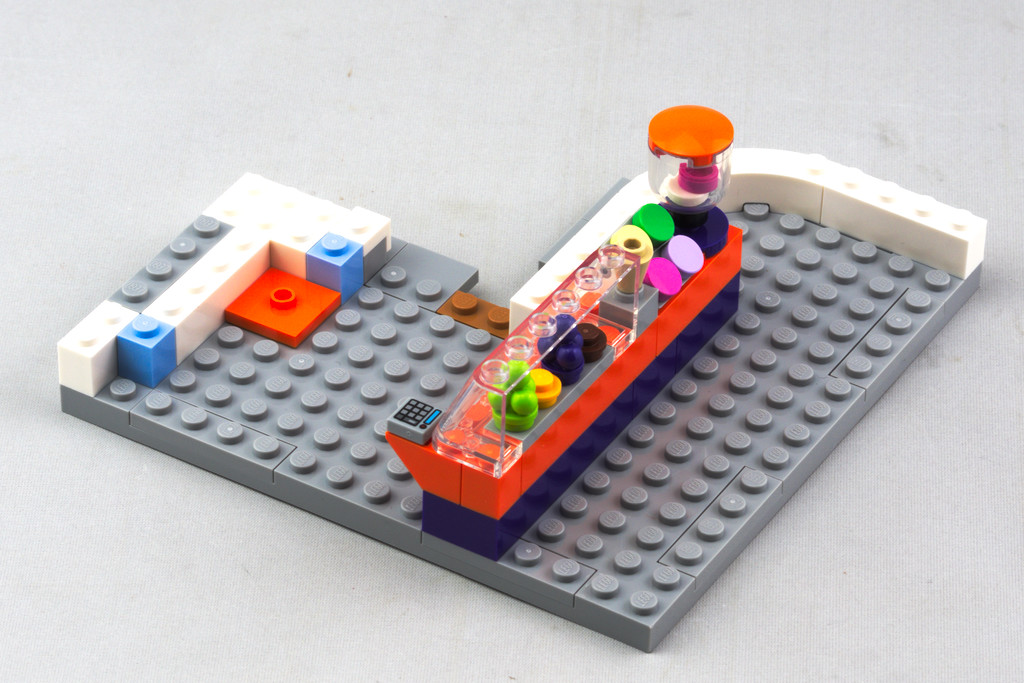 Les deux notices suivantes vont permettre de construire l’ensemble de la boutique. Celle-ci tient sur cette nouvelle plaque spéciale en angle droit et qui rendra bien solide l’ensemble. Une première rangée de briques délimite les contours, puis vient le comptoir en orange et dark purple. De nombreuses pièces colorées sont posées en partie derrière un pare-brise qui fait office de vitrine, et on ajoute un blender à l’extrémité.