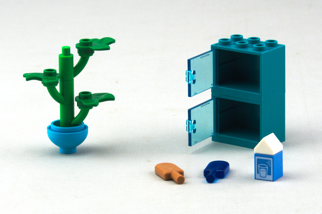 On place ensuite les nombreux éléments vitrés, qui sont malheureusement en vrac dans les sacs et comportent d’inévitables rayures (si nécessaire vous pouvez contacter le service client pour les remplacer). Une nouvelle rangée de briques, plaques et tiles consolide l’ensemble. On « remplit » l’intérieur avec une plante verte et un double frigo contenant une brique de lait et deux bâtonnets glacés.