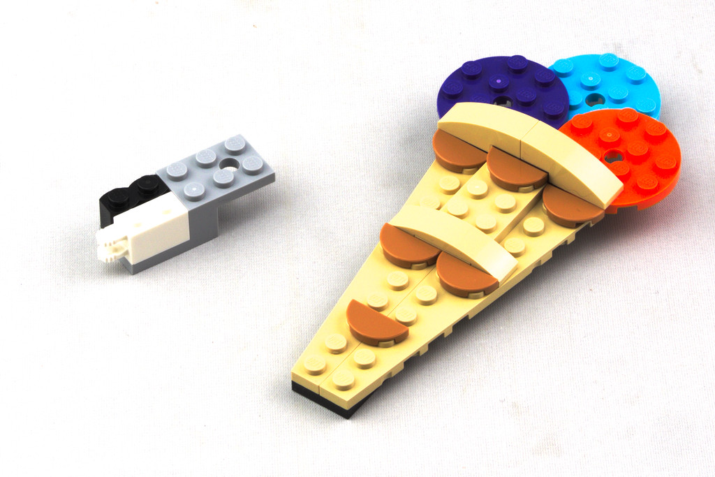 Ce set contient trois minifigurines dont la vendeuse déguisée en ours polaire, mascotte de la boutique. Elle a un torse inédit avec le logo coloré du magasin et ses bras reprennent le code couleur de la glace dudit logo. La jolie tête moulée d’ours est également une nouveauté inédite à ce set. Sa tête à un double visage souriant ou joyeux.