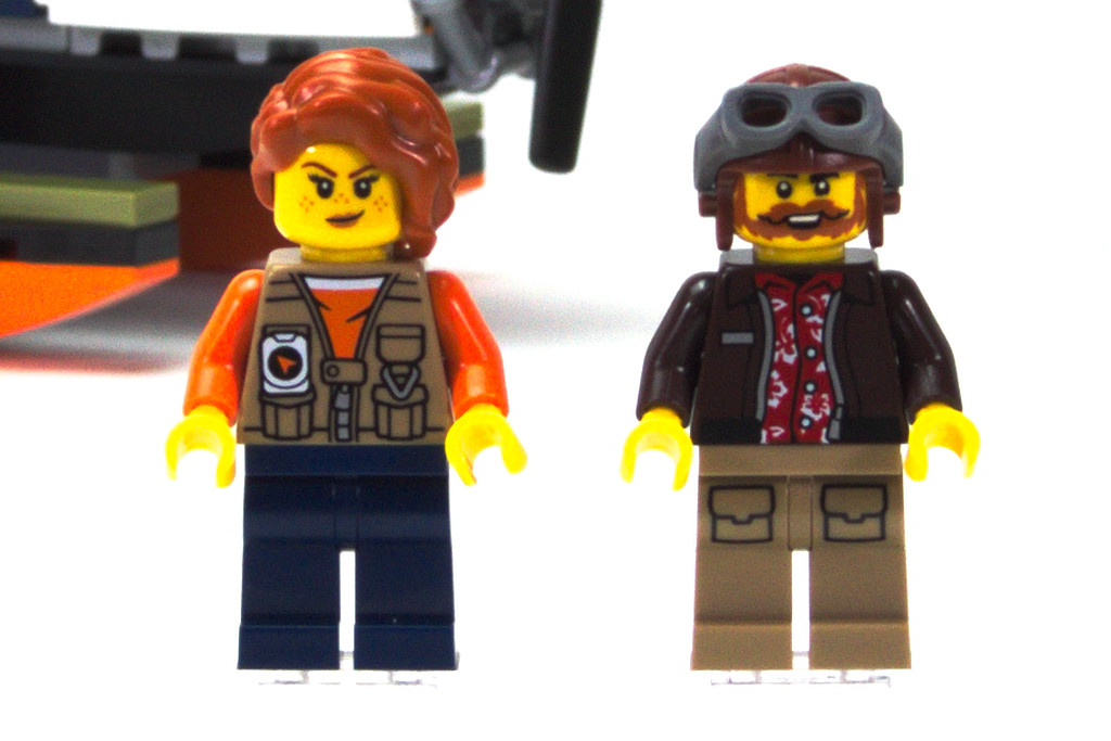 Pour cette aventure, on a deux minifigurines : un pilote et une photographe, joliment exécutés. Le pilote barbu porte une chemise à fleurs sous son blouson et un pantalon à poches. La photographe adopte les couleurs orange et dark blue de l’avion et porte un gilet multi-poches. Sa longue chevelure cache un double visage, simplement souriant ou avec un œil fermé pour regarder dans le viseur de l’appareil photo. Ce dernier fait partie des quelques accessoires avec une boussole, une clé et une carte.