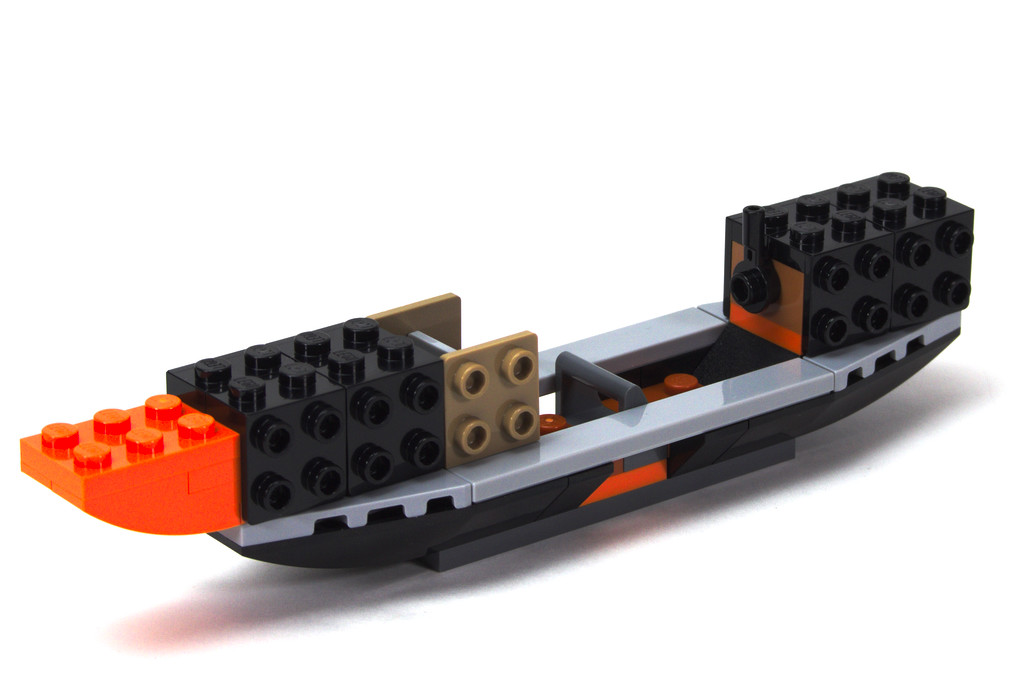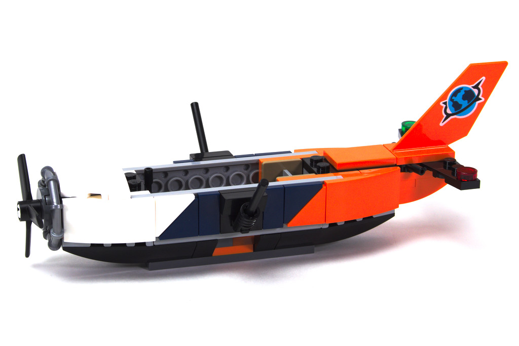 L’hydravion est également rapide à construire et assez simple de conception (set 6+). Le plus intéressant est la structure SNOT de chaque coté de la coque à l’aide de brackets. Cela permet de décorer les profils avec des tiles, dont des triangulaires, ce qui donne une alternance de couleur en biseau et sans user d’autocollants ! Et avec la dérive tampographiée, on ne craindra pas la perte des décorations avec le temps. Le petit-ensemble ailes-verrière amovible reste bien en place, tout comme les flotteurs.