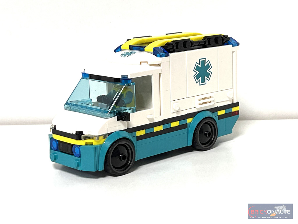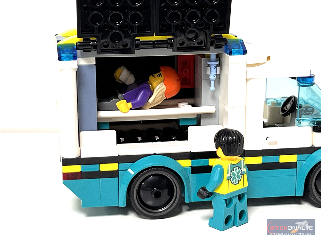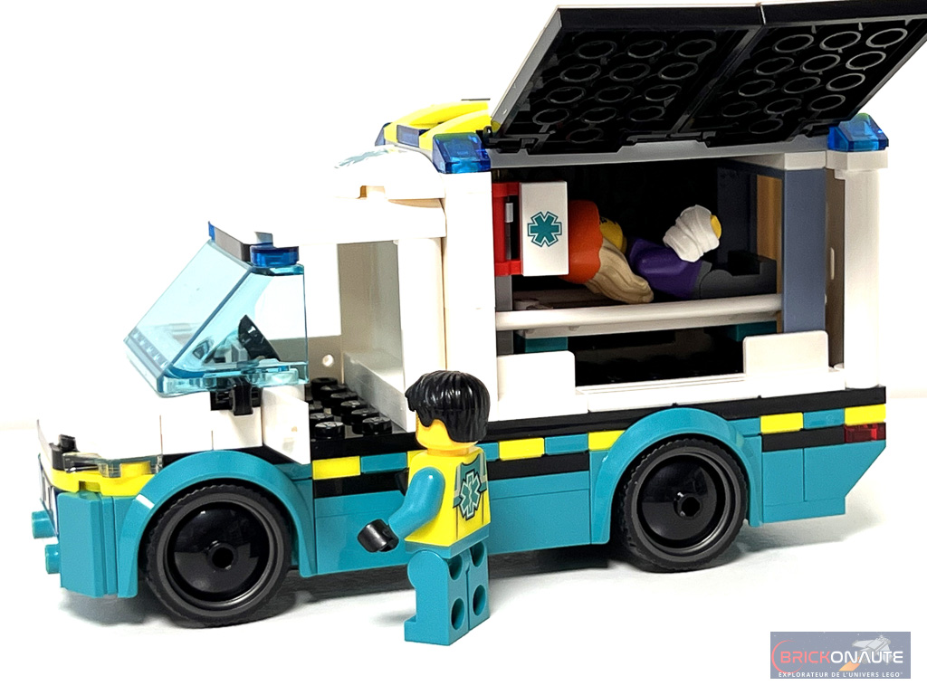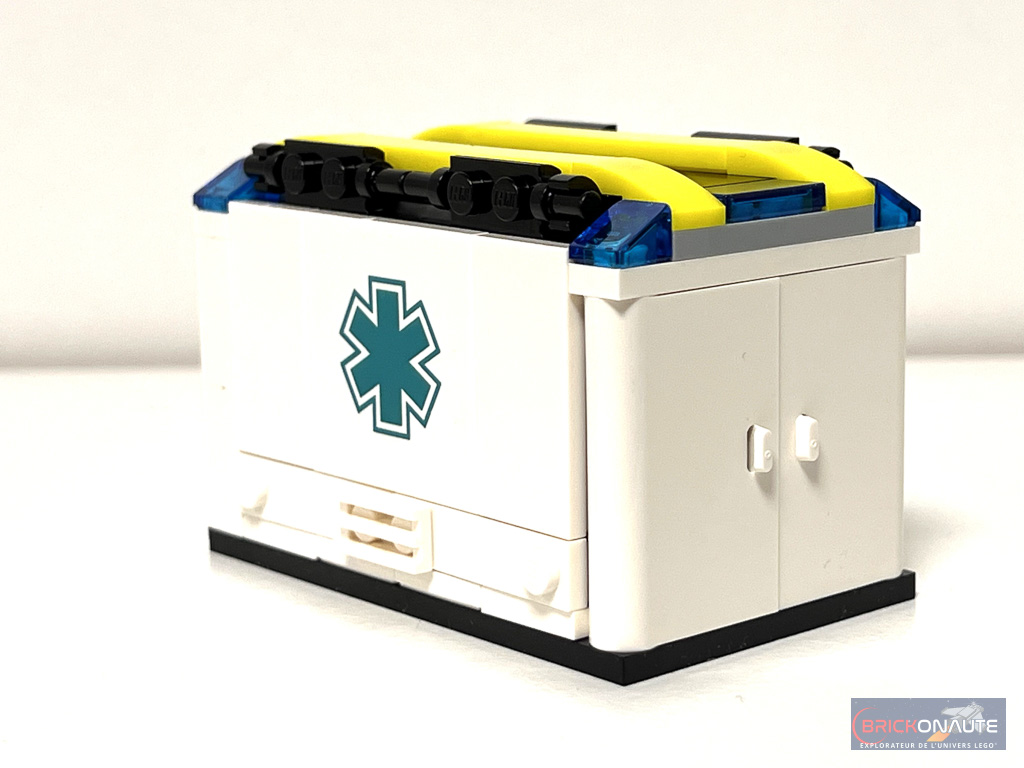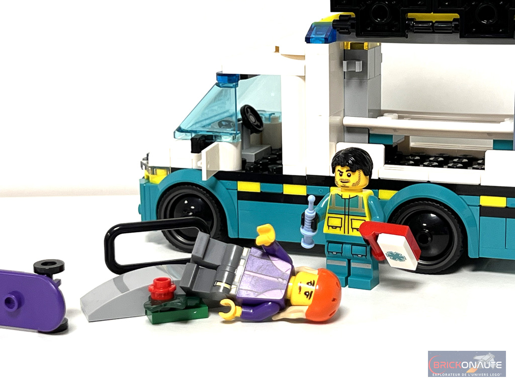 Elle est jolie cette petite ambulance de 6 tenons de large. Il y a un effort sur les formes et les détails comme des feux brickbuilt et les motifs alternants les couleurs jaune et turquoise sur la ligne de caisse. La cabine (d’une place) a son tableau de bord via la classique roof tile avec compteurs et les portes s’ouvrent. La benne arrière (détachable) est super accessible sur trois faces. On peut y accrocher la trousse de soins et la seringue. Le brancard s’y loge facilement avec ou sans minifig. La mini structure de skatepark est juste là pour expliquer l’accident mais ça fait le job.