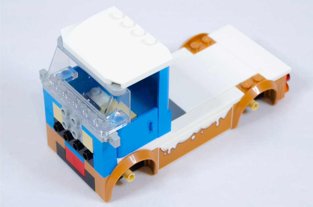 Tout se passe autour du châssis et les étapes sont la construction du plancher et des bas de caisse de l’avant vers l’arrière du véhicule. Il est déjà appréciable de constater que les grandes tiles dégoulinantes de crème sont tampographiées et sont donc bien alignées avec le reste de la carrosserie. Tout va assez vite puisque le porteur étant plat pour accueillir le stand à l’arrière, quasiment toute la construction est concentrée sur la cabine et son air rétro.