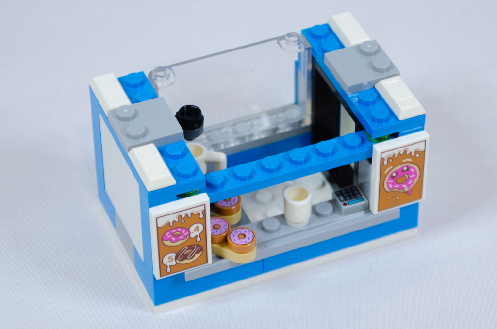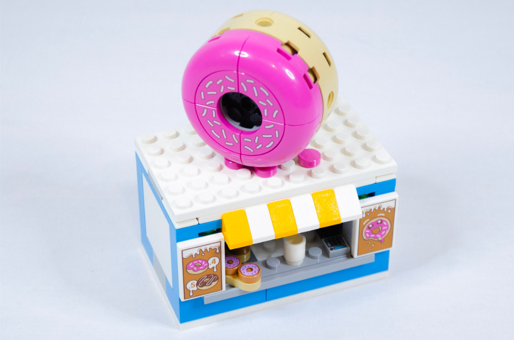 Le store est brick-built et le toit se résume à une grande tile blanche prenant toute la surface du stand. Pour terminer, et pour varier les plaisirs, le donut trônant fièrement tout en haut est plutôt réussi avec ses couleurs traditionnelles et ses tiles (là aussi) tampographiées. Il dégouline même un peu sur le toit, est orientable comme bon vous semble et est très pratique pour ouvrir le toit.