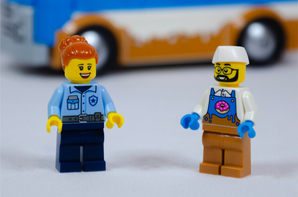 Enfin, que serait un set City sans minifigurine ? LEGO nous en propose deux, le vendeur et la cliente. Le vendeur (que j’appelle Doug pour faire un mauvais jeu de mots) est habillé avec des jambes simples dans la couleur du donut et une salopette bleu dégoulinante sur le marron. Il a des mains bleues (je suppose pour représenter des gants de service), un joli calot penché et un visage mono expression (calot oblige) ; aucune coiffure n’est fournie pour lui.
