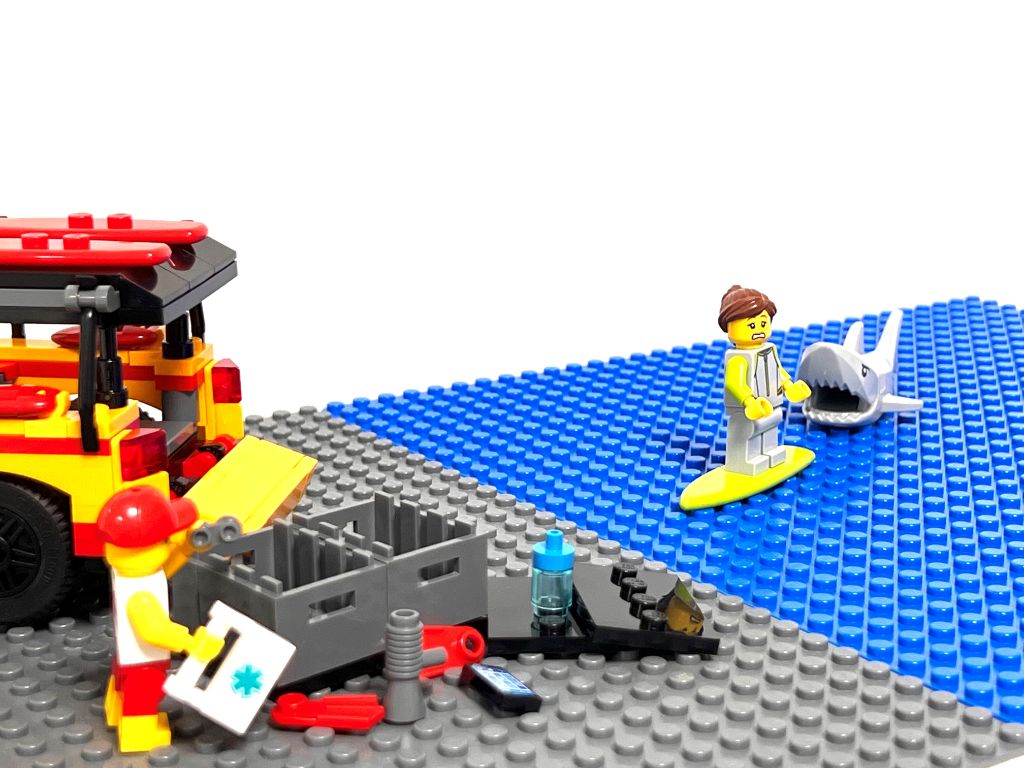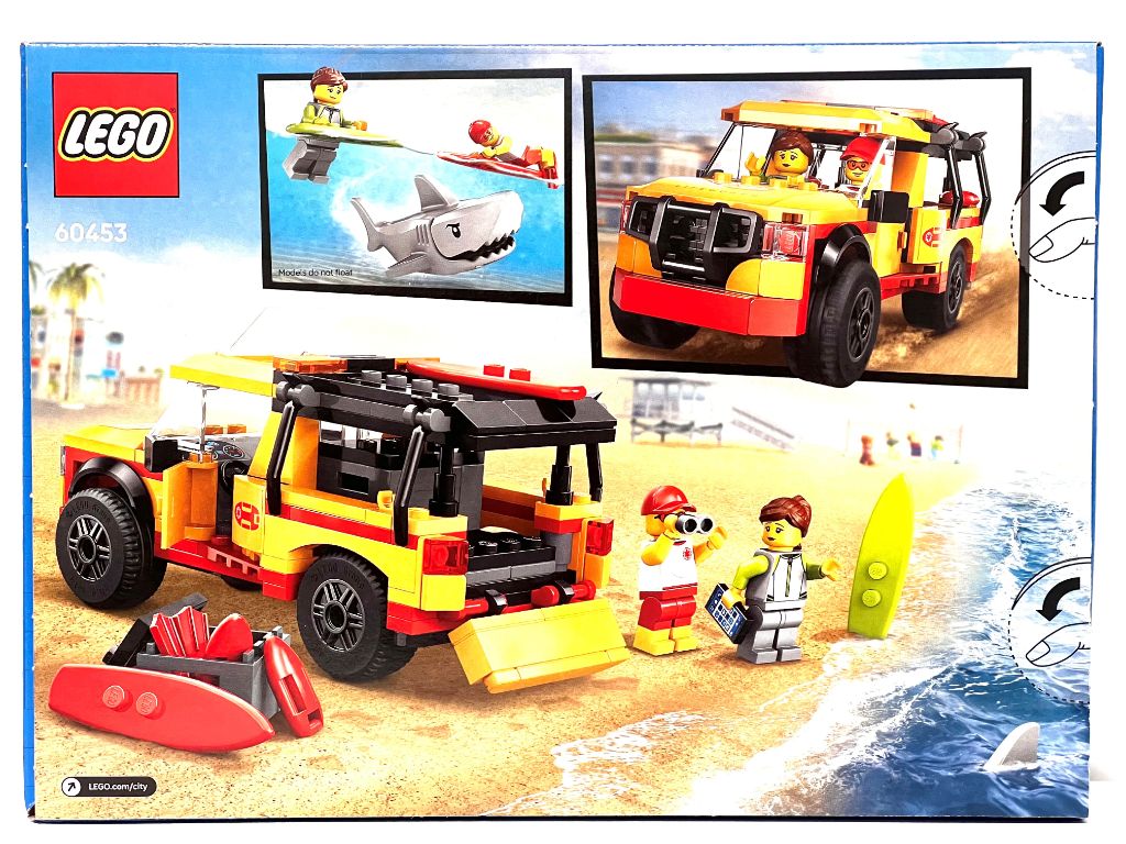 En face avant, le sauveteur a garé son véhicule sur la plage et s’apprête à porter secours à la surfeuse effrayée en apercevant un requin dans sa vague. En arrière plan on devine une ville côtière et on peut même apercevoir dans le ciel l’avion du set 60367.