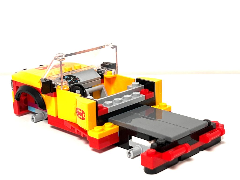 A l’avant il y a deux portières et un toit ouvrant. On peut y loger les deux minifigs, quasi exploit réalisé avec l’usage des plates 1X2 W. 1 KNOB pour y emboiter chaque personnage via une seule jambe. Il faut juste accepter l’extrême promiscuité d’un tel espace restreint 😉.