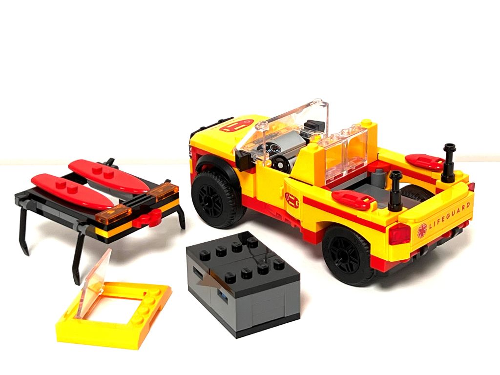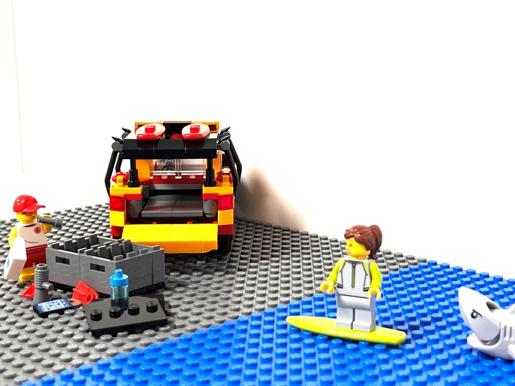Le véhicule est solide et fonctionnel. On peut loger dans la cabine (avec portes et toit ouvrant) les deux minifigs même si c’est un peu galère. La benne est équipée d’un hayon et d’un fond studless pour faire glisser les caisses d’accessoires. Lesdits accessoires sont particulièrement nombreux (planches de surf et de secours, palmes, mégaphone, jumelles, smartphone, trousse de soin et gourde). Il y a évidemment les deux protagonistes bien identifiés dans leur rôle. Et on a aussi l’ami requin pour pimenter le tout.