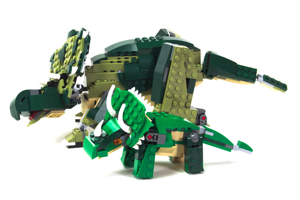 Même s’il est un peu moins détaillé, le tricératops réutilise une bonne partie des éléments et est plutôt réussi dans son esthétique, surtout sa tête qui a un air sympathique. Il réutilise aussi de nombreuses articulations pour ses mouvements.