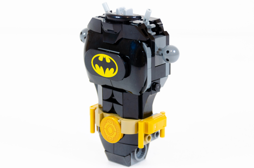 Donc, le premier sachet contient de quoi faire le buste et les cuisses. Le buste se compose de pièces assez solides autour du coeur, j’aime ce genre de détails. Quelques pièces de couleurs viennent un peu égayer tout ce gris et noir. Les premières articulations apparaissent avec les épaules. L’utilisation de « curved slopes » permettent d’obtenir un bel arrondi des hanches et des pectoraux. J’aime aussi le détournement des passages de roues vus sur les voitures pour entourer le cou. Nous allons même jusqu’à construire le « 6 pack » qui n’en a que 4 pour le coup. Nous terminons le buste avec la plaque tampographiée du logo de la chauve-souris.