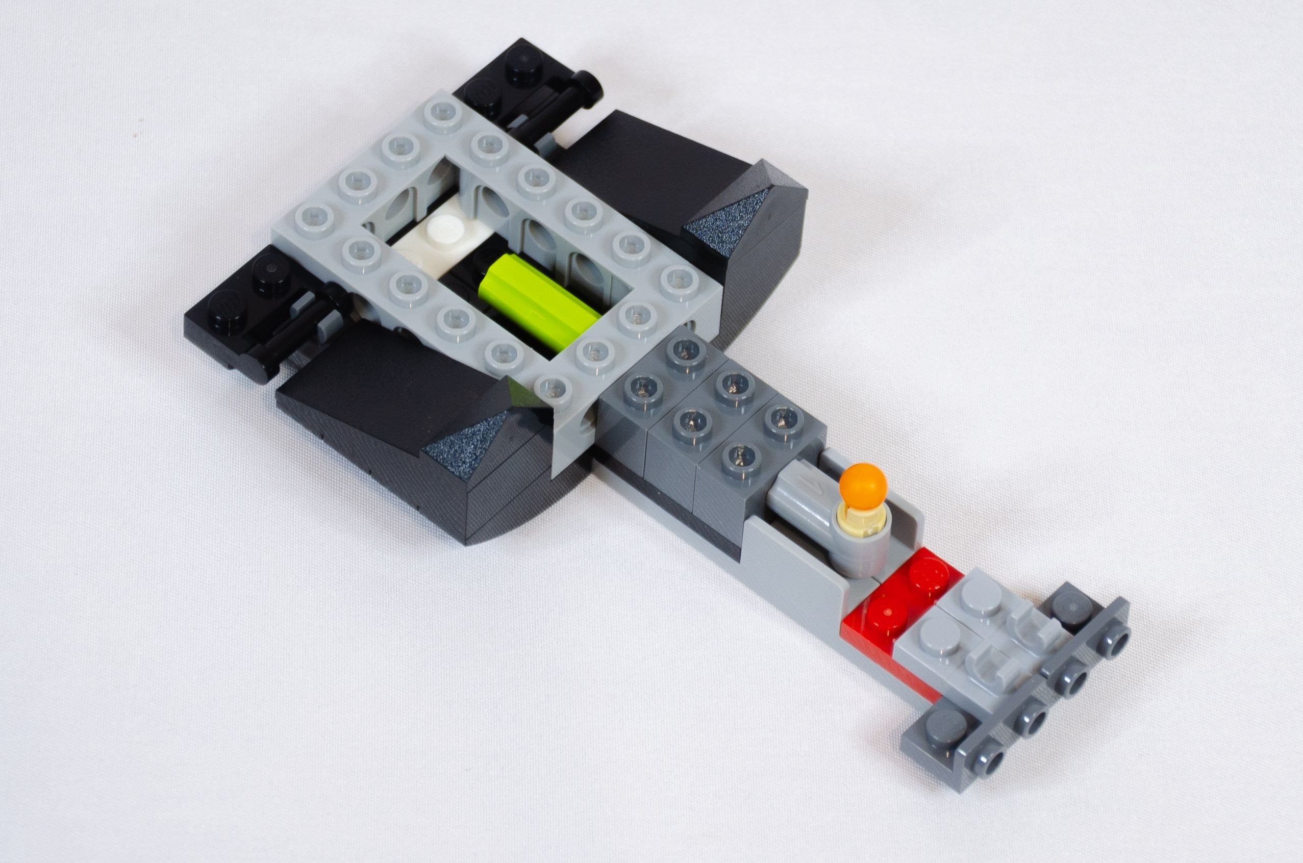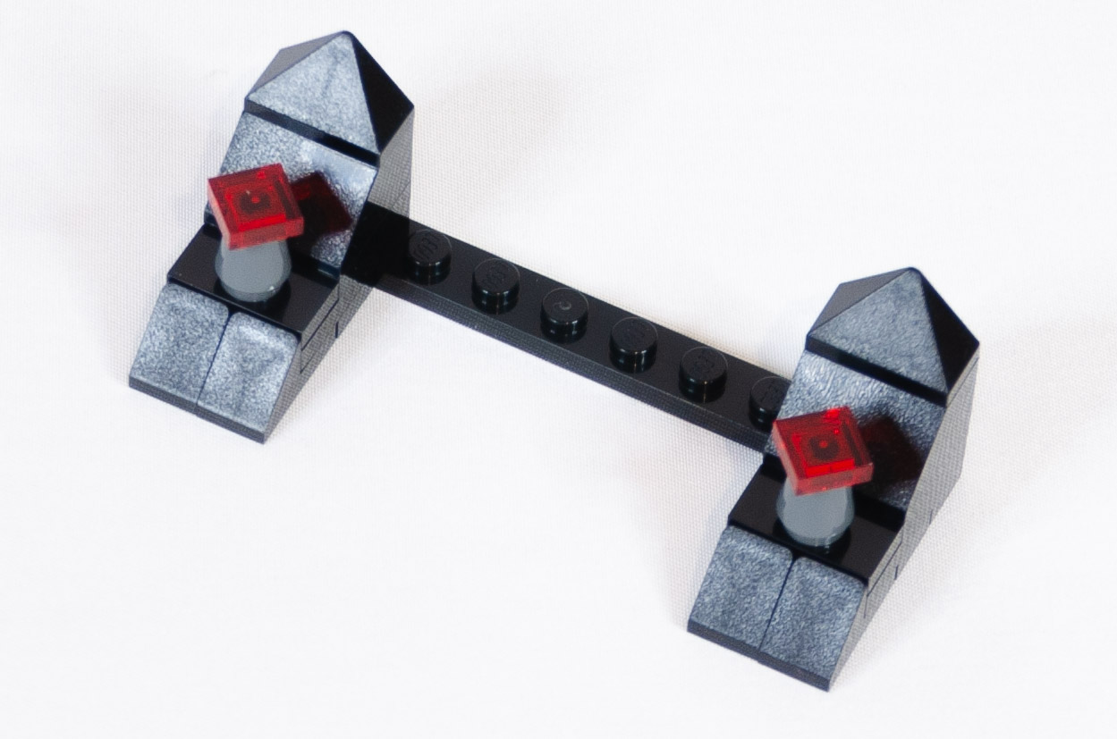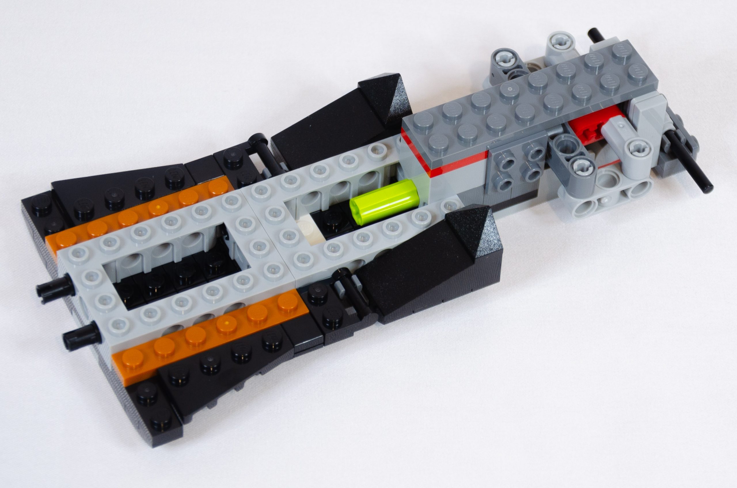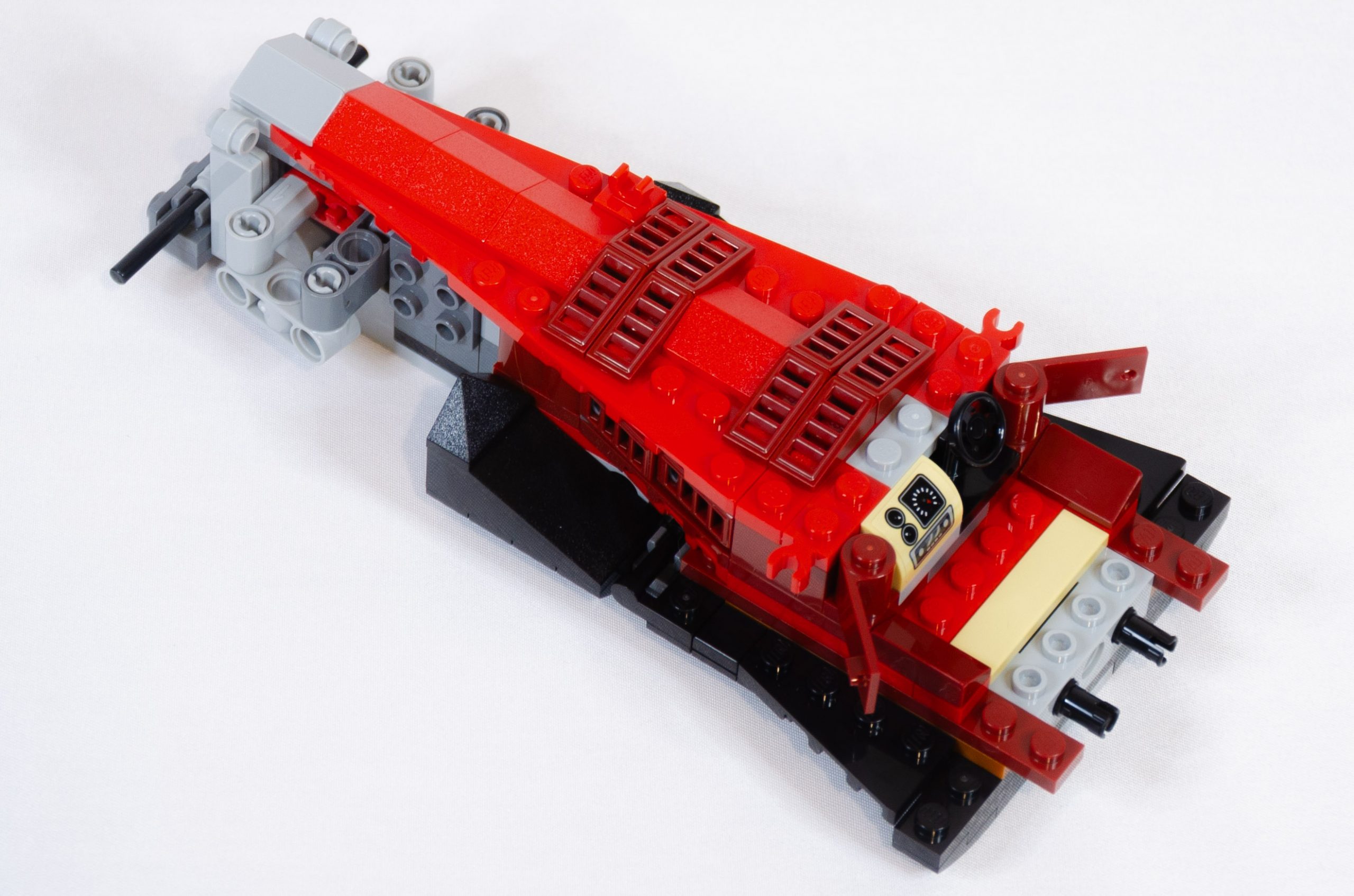 Dernier sachet, point principal de la construction, le coffre. L’inclinaison de celui-ci est obtenu avec deux briques charnières (hinge brick 2*2 top plate). Après les passages de roues, un sous-ensemble permet de créer les “tampons” et les feux rouges.