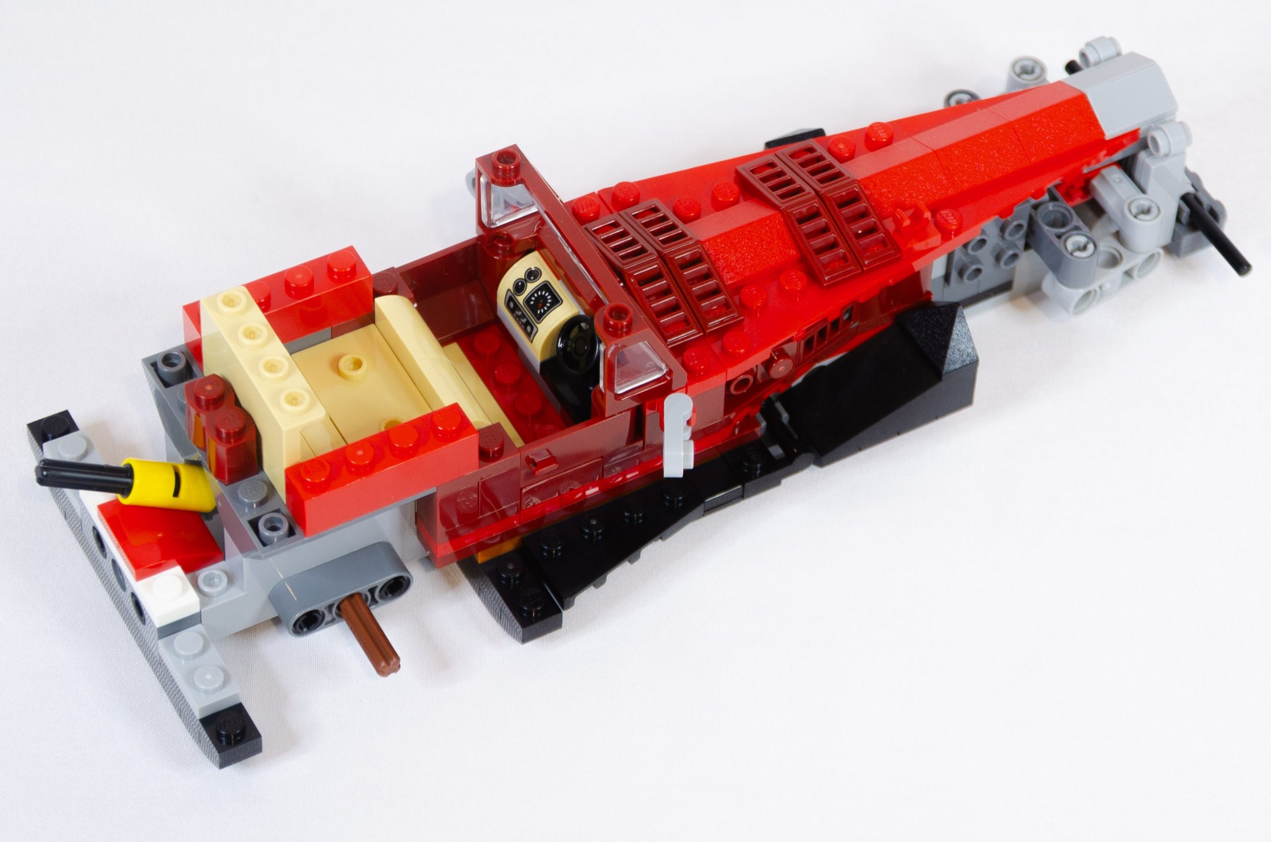 Le second sachet commence par le long capot, simplement réalisé avec deux grands triangles rouges (12*3) sur lesquels sont disposées quelques rampes afin de donner du relief à tout ça. Une fois le capot réalisé, l’habitacle est de la partie. La décoration du tableau de bord est réalisée avec le premier autocollant, pour le reste, c’est très sobre : un volant, des sièges brick built et la plage arrière qui cache l’axe de direction. Peu de pièces inédites dans ce set mais la pose du pare brise vous le fera découvrir en dark red et cette couleur est pour l’instant inédite ici. Par contre, la pièce transparente du pare brise étant libre dans le sachet, quelques rayures peuvent venir la décorer.