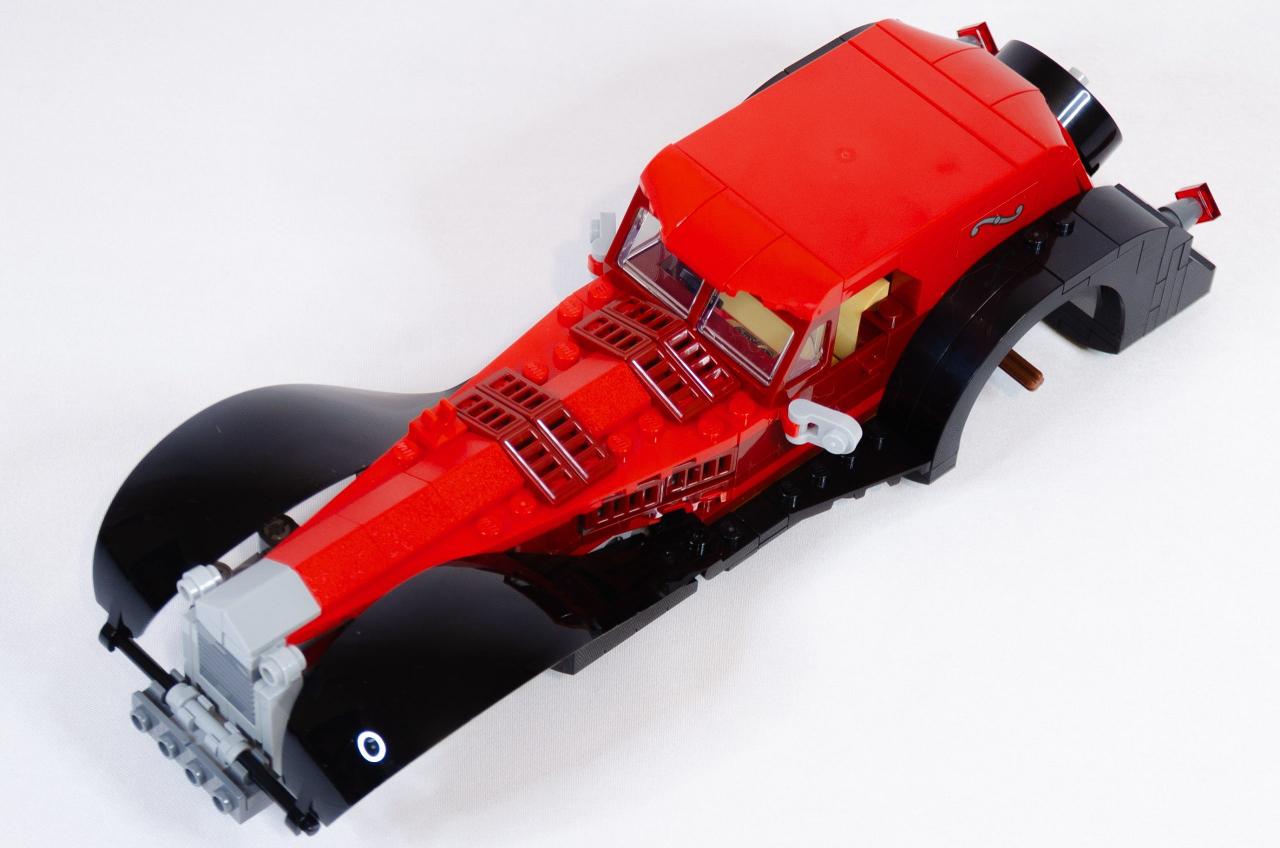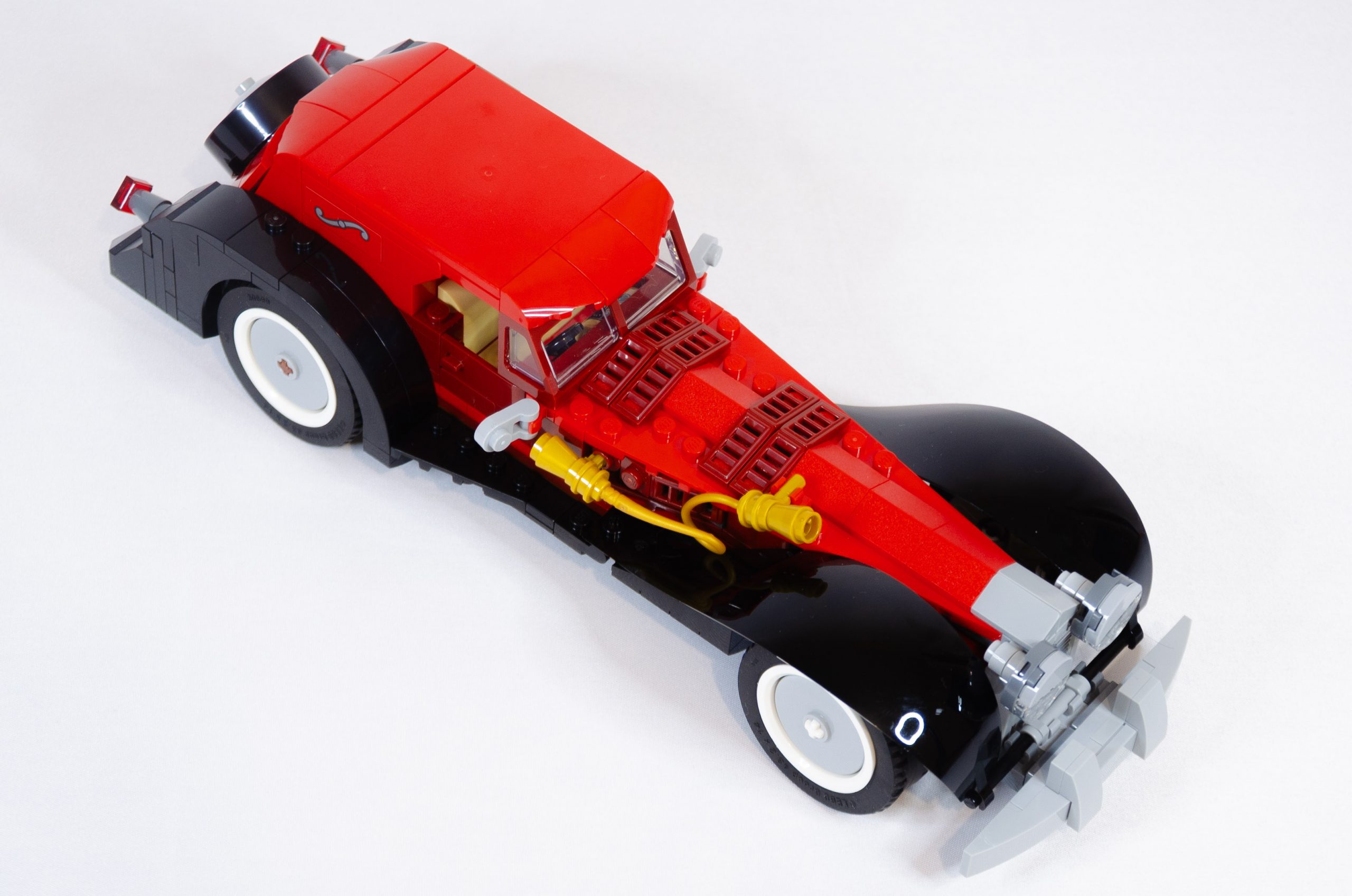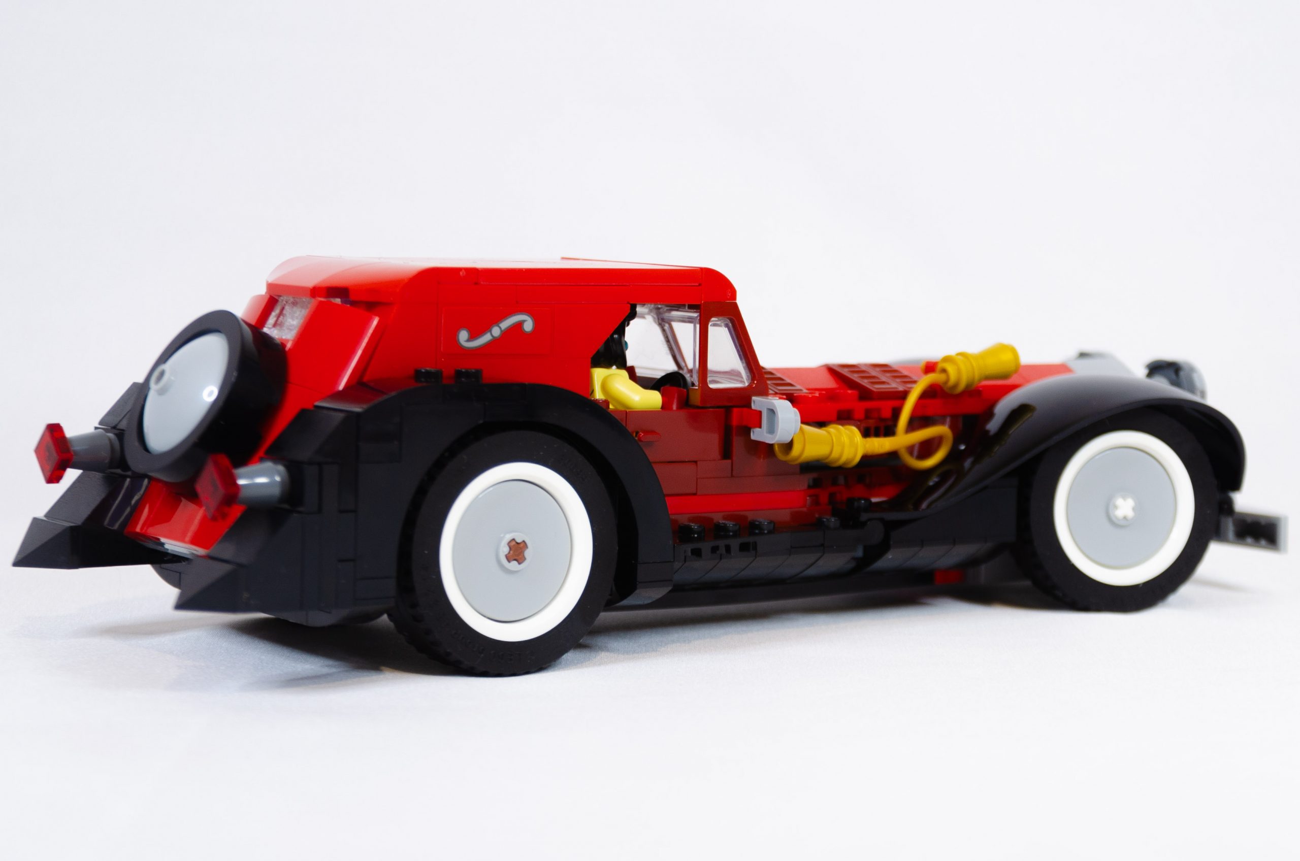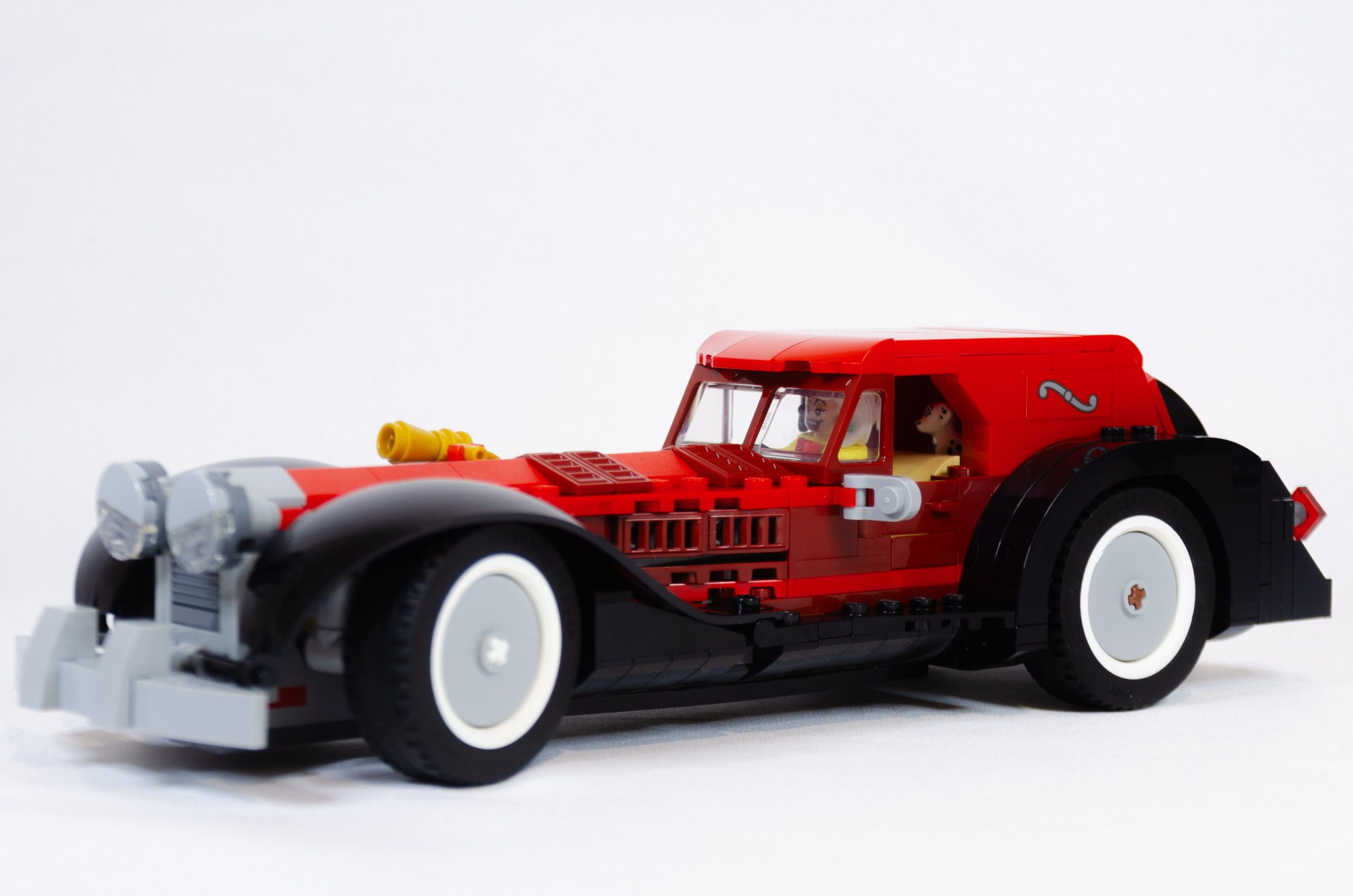 Le capot de coffre et la lunette sont réalisés avec des slopes. A noter que la lunette est faite avec deux épaisseurs de pièces transparentes, il n’est donc pas possible de voir à travers. Enfin, la roue de secours est positionnée sur l’axe de direction et vous pouvez tester que tout cela fonctionne correctement. Un bref passage sous châssis pour consolider le tout et décorer les flancs du moteur, l’installation des deux très beaux garde-boues avant donne déjà fière allure à cette voiture. Maintenant, il ne reste que les petits éléments : le klaxon doré, le pare choc avant et les feux agressifs (bruick built). Installation des quatre roues avec les enjoliveurs et voilà, Cruella a sa voiture pour partir aux emplettes.