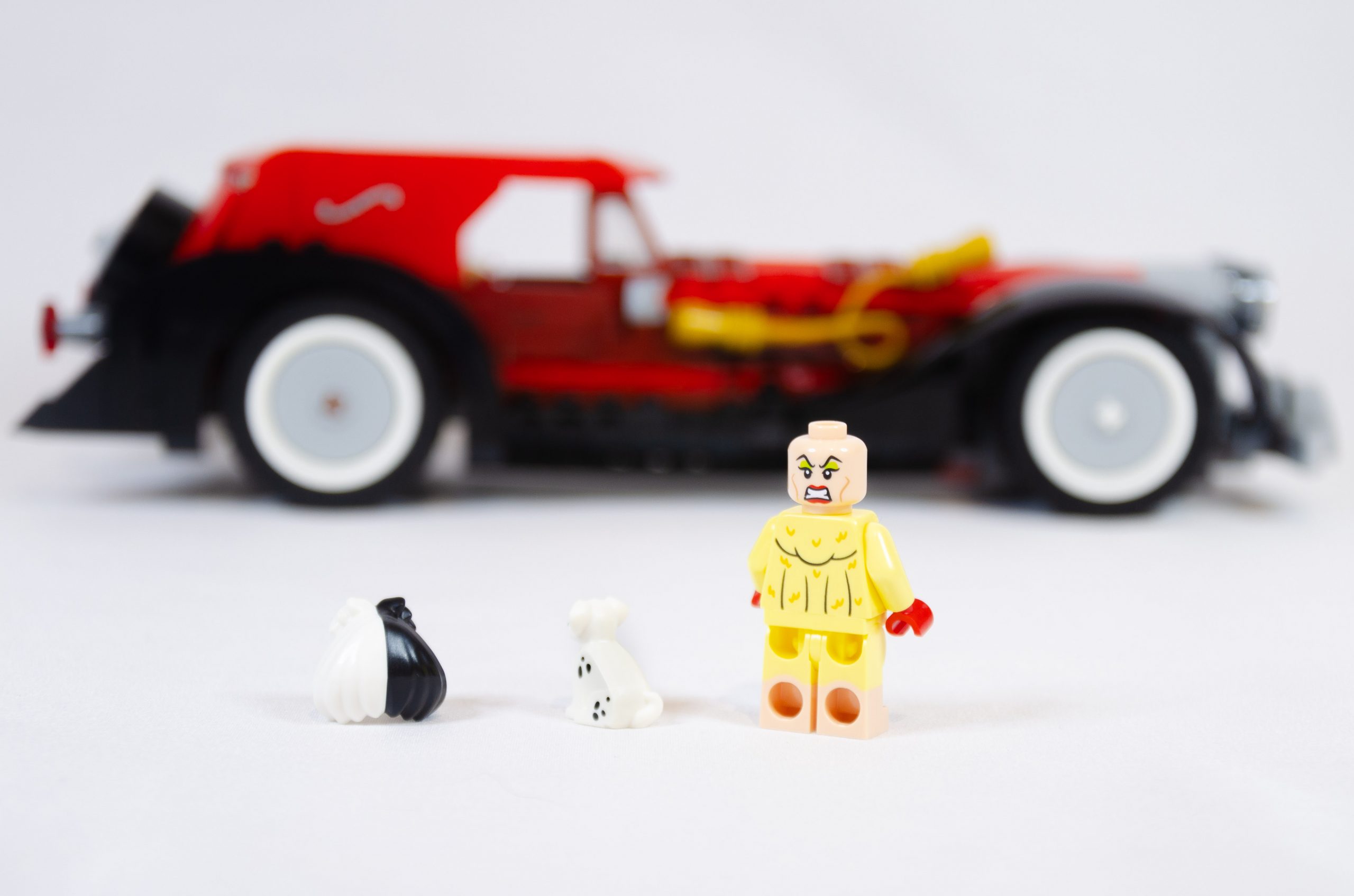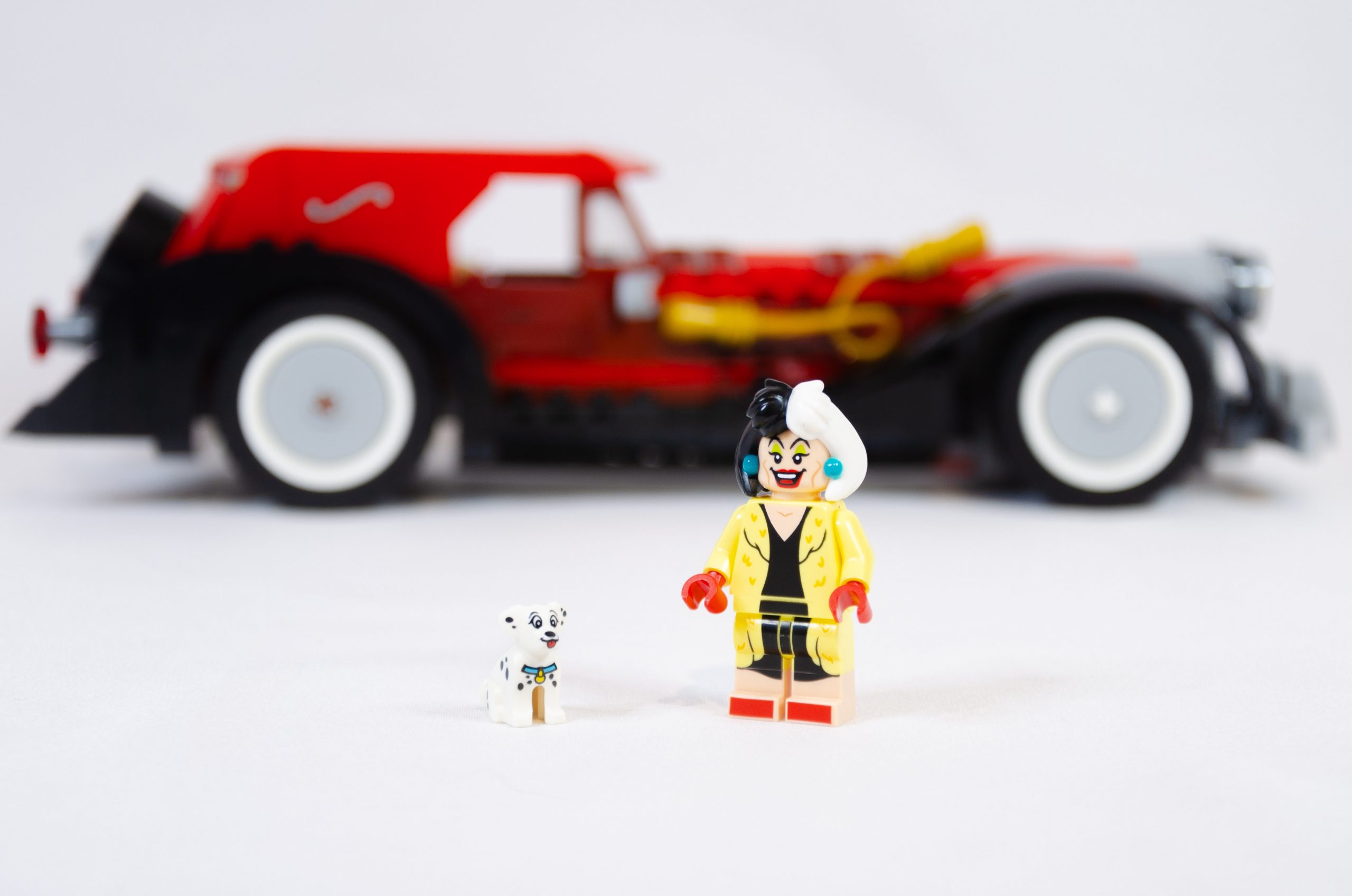 Cruella est, elle aussi, inédite dans cette tenue. C’est la seconde interprétation au format minifig, précédemment apparue dans une des séries à collectionner (déjà accompagnée d’un dalmatien et de son manteau). Le personnage a aussi eu le droit à sa version minidoll.
