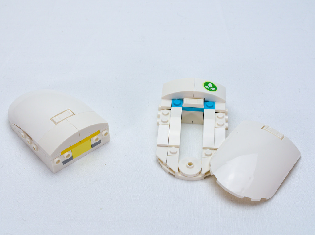 EVE et sa forme arrondie est plus difficile à retranscrire en briques. Pour autant, c’est également réussi. Les éléments de coques arrondies devant et derrière participent beaucoup à la forme, tout comme les bras qui se collent et « se détachent » du corps. La tête en mode suspension permet de se mouvoir sur sa ball joint, tout comme le support pour la faire léviter.