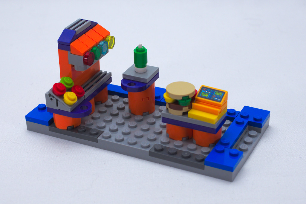 Reste à monter les accessoires extérieurs du restaurant, eux aussi modulables, avec la terrasse, le panneau de commande et le plant de piments. Le dernier sachet est dédié à la grosse enseigne avec le nom du restaurant dont on colle l’autocollant sur une round tile 6×8 oval. La tête de burger apporte un peu de technique à base de SNOT, et une charnière permet d’ouvrir « sa bouche ».