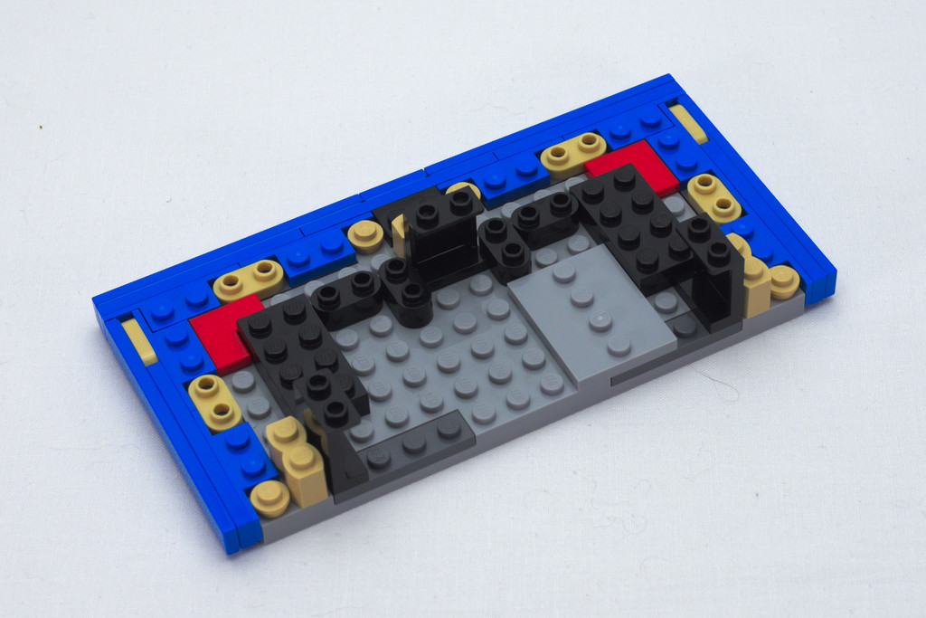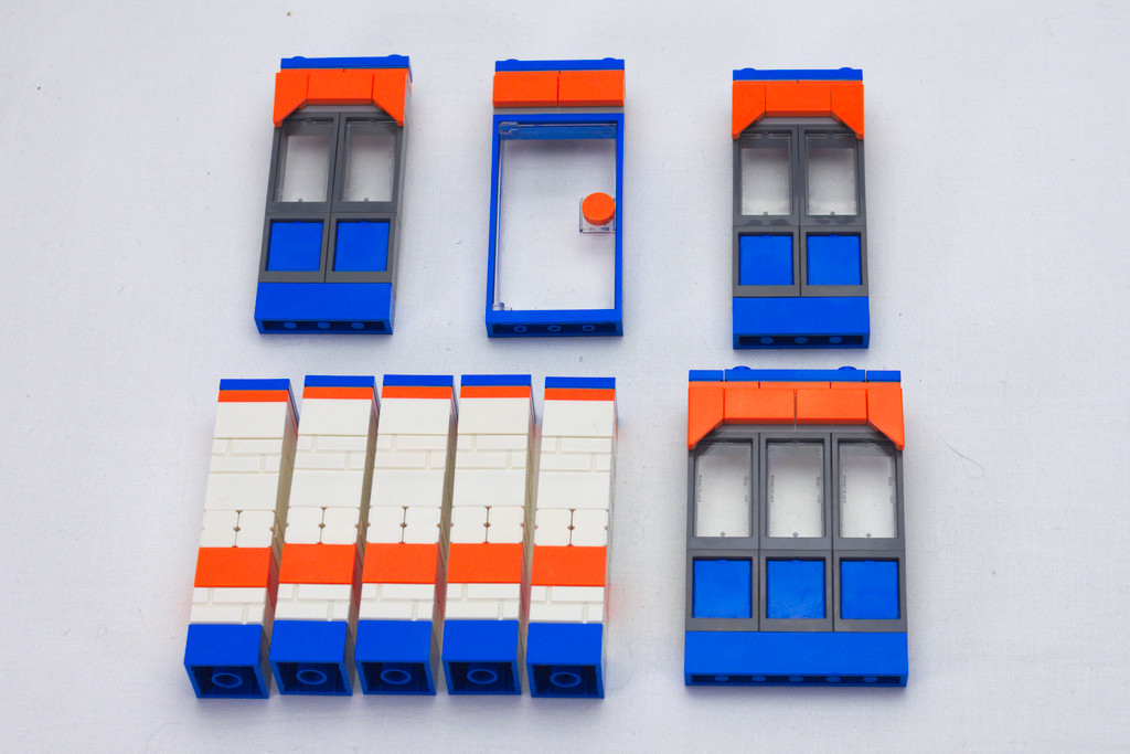 Dans la boite au format carré on retrouve cinq sachets plastiques (ils n’ont pas encore disparu), 2 plates 8×16 spécifiques en vrac, la notice, et la petite planche de quatre autocollants. Le dos de la boite annonce le côté modulable de ce morceau de restaurant.