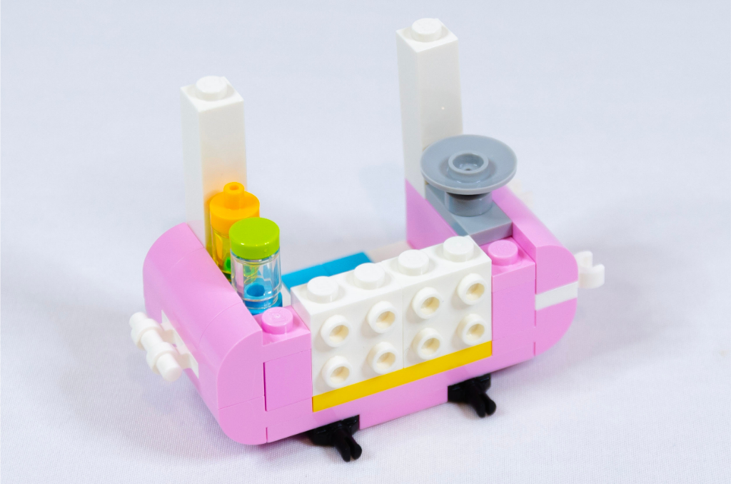 Le second sachet permet de commencer le stand ambulant, aucune méta pièce ici, tout est à base d’assemblage sans aucune surprise ; ce qui n’est pas péjoratif, le set étant destiné aux plus jeunes. Le “fond” du stand est terminé, passons à la dernière étape.