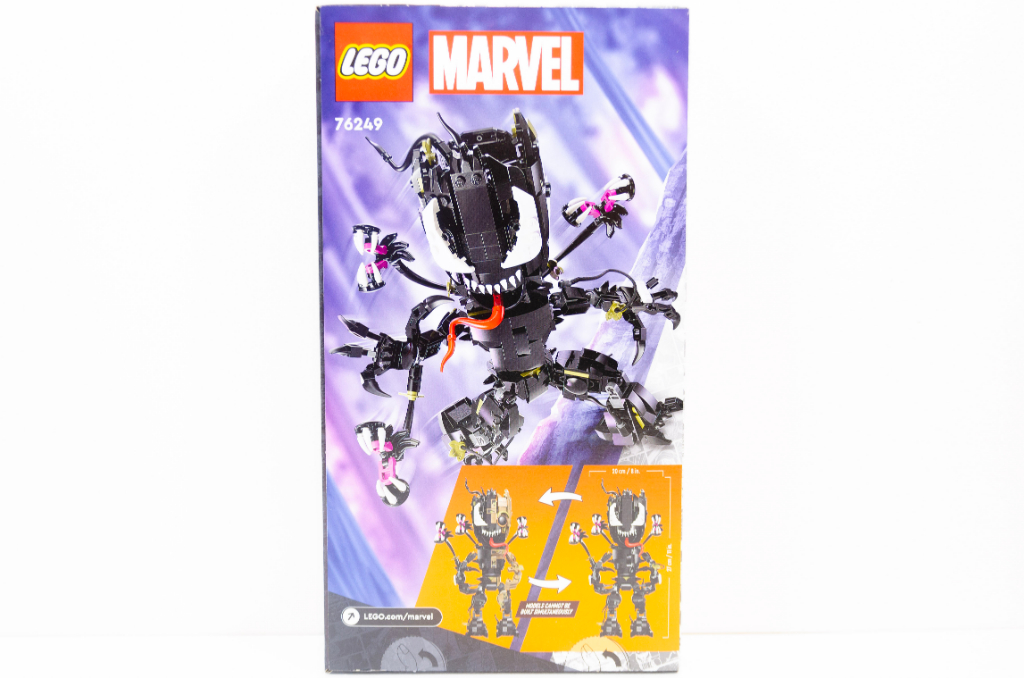 Je trouve la boite plutôt grande pour ce que j’en attendais, logiquement au format portrait, elle montre en face avant Groot en cours de venomisation marchant vers nous. Avec cette image, nous pouvons déjà voir quelques articulations et les différents tentacules qui doivent permettre de mettre en action notre arbre préféré. L’arrière met, cette fois, en avant la version totalement venomisée de Groot et je reconnais que j’aime bien cette version. Au bas, deux encarts nous montrent qu’il est possible de passer d’une version à l’autre, comme une sorte de 2 en 1 et j’espère que cela se fait facilement.