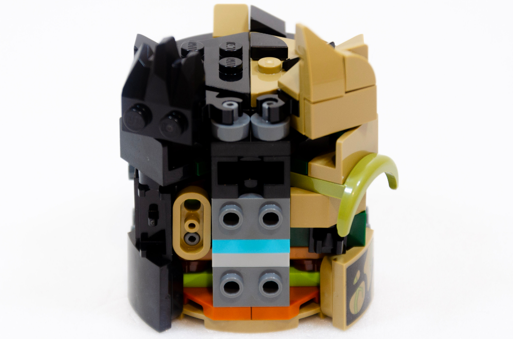 Comme pour le cœur, un petit clin d’œil avec un cube rose à la hauteur d’où pourrait être le cerveau. Beaucoup de petites pièces et de petites constructions permettent d’apporter pas mal de détails, ainsi les sourcils, le haut du crâne sont assez bien définis. Quelques éléments vus sur les véhicules City sont aussi détournés, comme un passage de roue ou quelques capots.