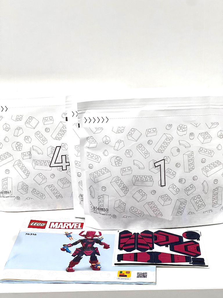 A l’intérieur et bien tassés, on trouve quatre sachets de pièces (comme par hasard…), une planche de stickers et la notice. Pour ce qui est de l’inventaire, partiel ici ou complet ici, on a notera évidemment les tenues exclusives des héros (du moins en partie, on verra cela dans le chapitre dédié), la tête imprimée de Galactus et quelques autres pièces.