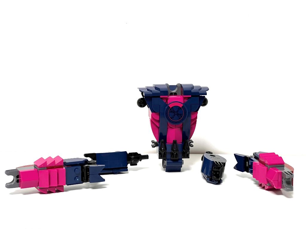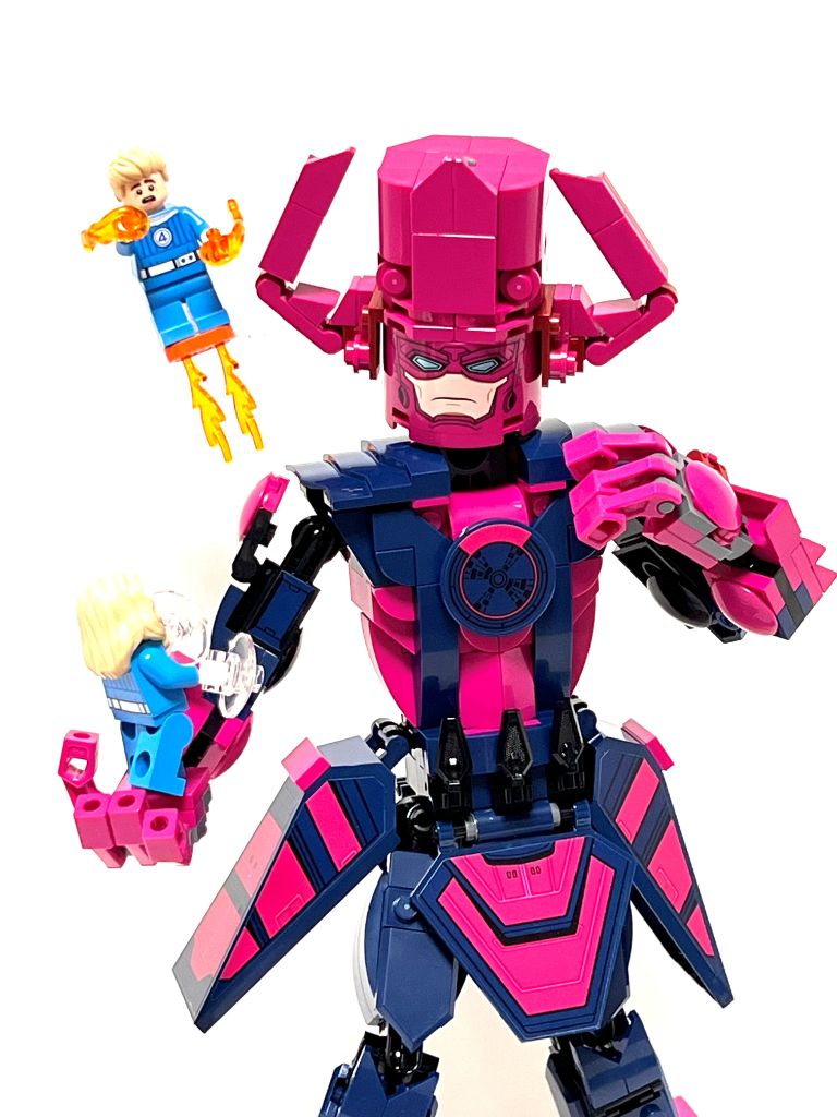 Le grand « méchant » Galactus affontre les Quatre Fantastiques (ou le contraire 🤔). La promesse est globalement tenue avec un figurine géante plutôt bien articulée et des héros dont on comprend à peu près les pouvoirs. Il y a plein de tenons qui ont été volontairement disposés pour y accrocher les minifigs, que ce soit sur les pieds ou dans les mains. C’est malin et autorise plein de mises en situation.