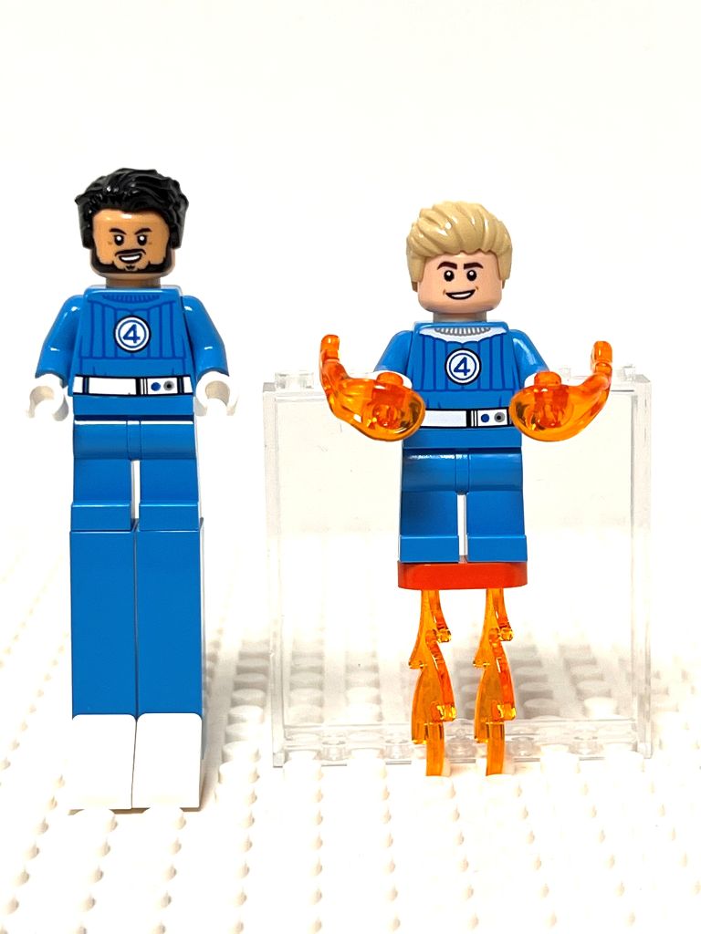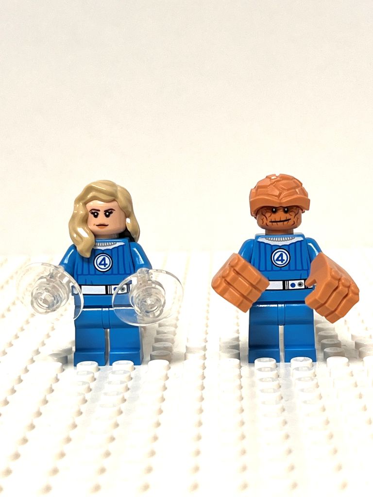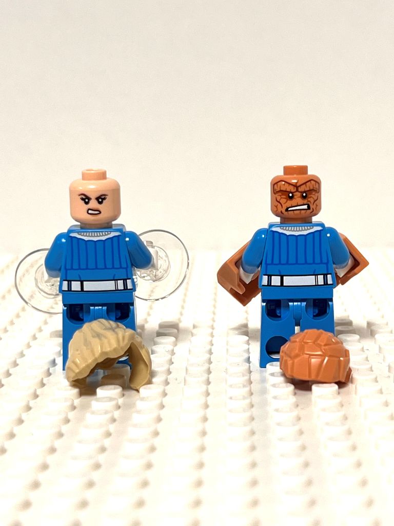 Les torses sont donc inédits et Mr Fantastic a sa propre version avec un col bleu quand le reste de l’équipe en a un blanc. Jusque là c’est plutôt fidèle mais c’est maigre quand il manque les bottes blanches à tout le monde (on ne compte pas la facilité d’avoir posé deux briques sous des extensions de jambes pour Reed), les demi manches blanches pour Ben and Johnny sont également aux abonnés absents… La Chose est quand même bien plus épais que ses comparses, un appendice comme pour Chewbacca, ou même un torse inédit aurait été le bienvenu.