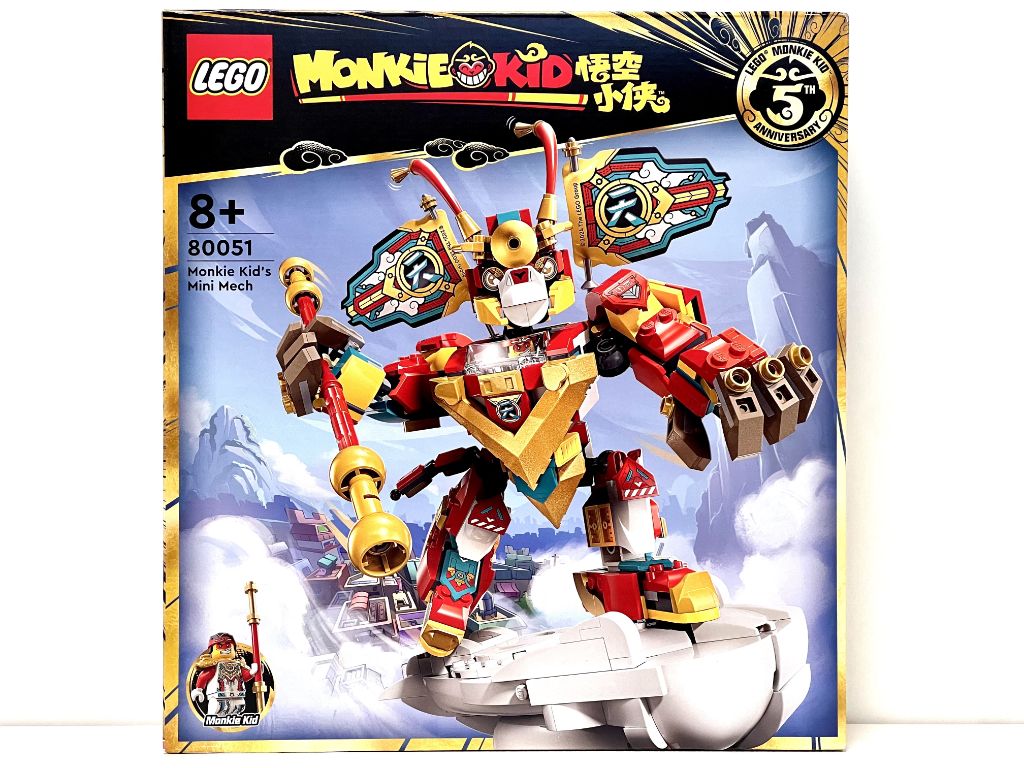 La boite, de taille correcte pour le nombre de pièces annoncé, présente en face avant une très belle mise en scène du robot sur son nuage volant avec Monkie Kid aux commandes. Le coin supérieur droit nous informe que nous sommes déjà dans la cinquième année d’existence de cette gamme. Dans le coin inférieur gauche, une vignette indique la présence de la minifig de Monkie Kid.