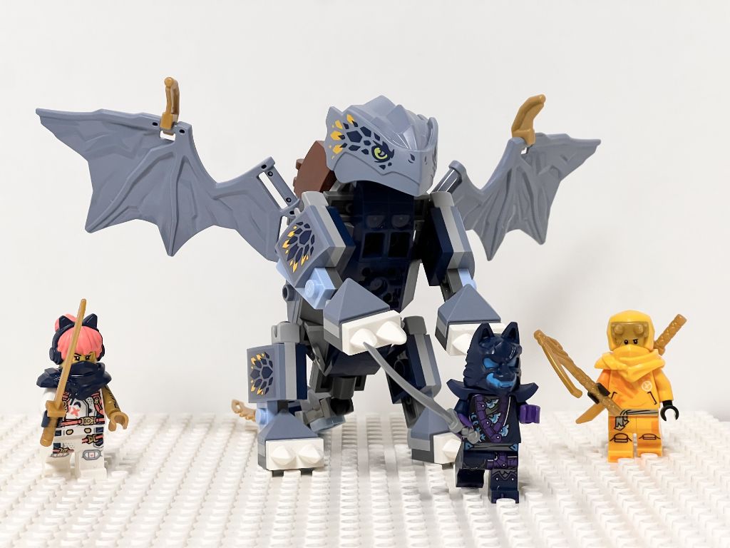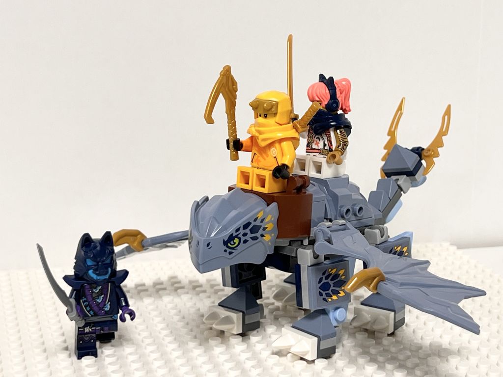 Le dragon est très solide à la manipulation d’un enfant. On peut y installer deux minifigs. La confrontation gentils vs l’unique méchant se fera sans stud shooters ou autre artifice. Mais l’imagination d’un enfant ne s’en souciera guère et il pourra même essayer de mettre en place l’affrontement des 3 minifigs contre la bête par exemple.