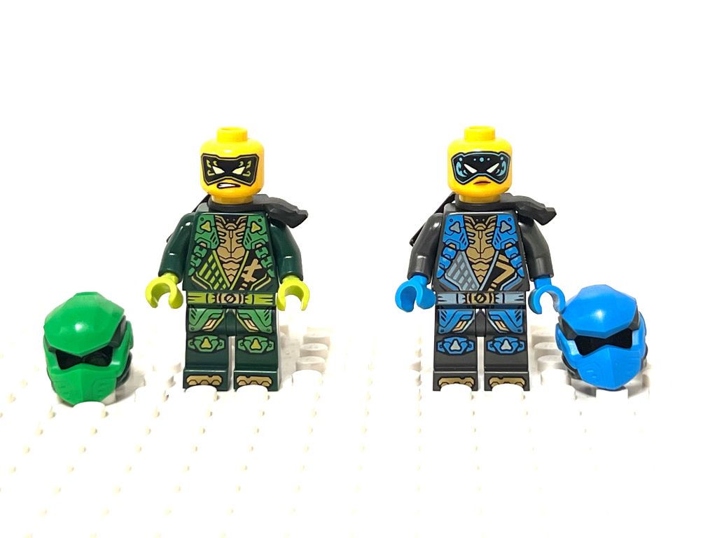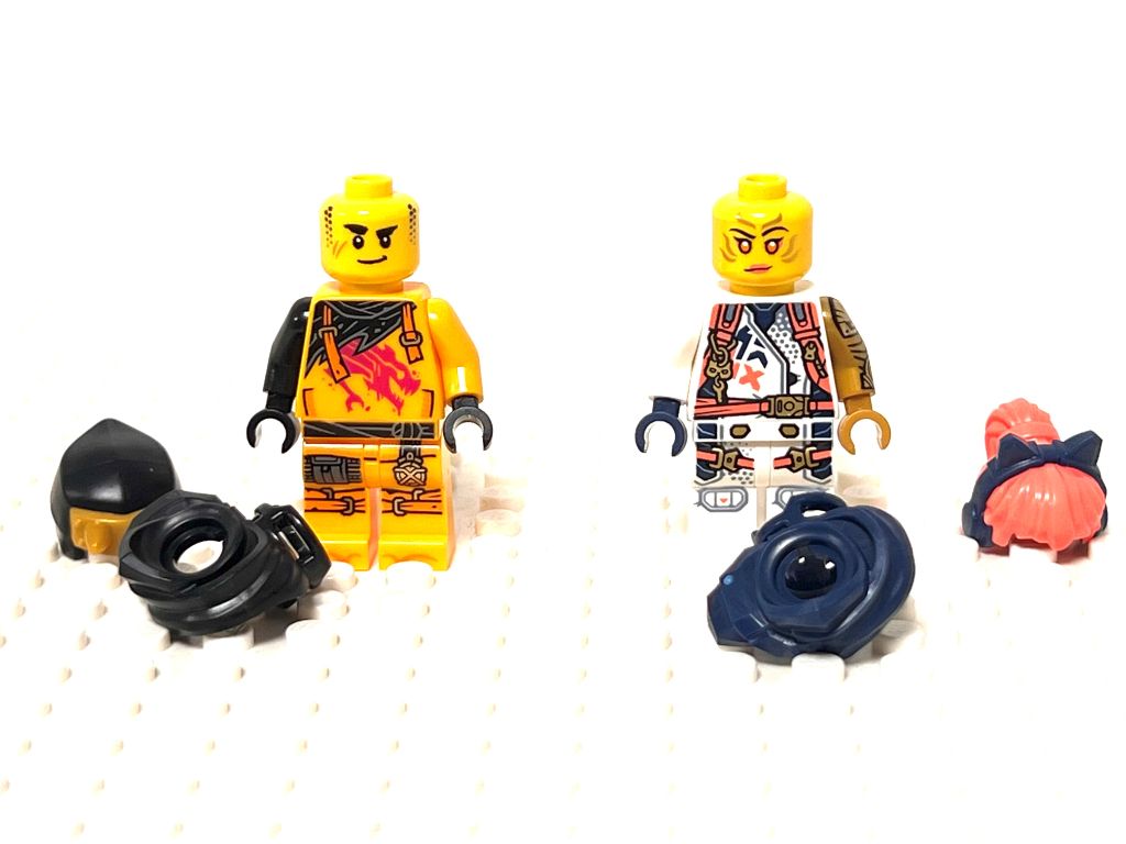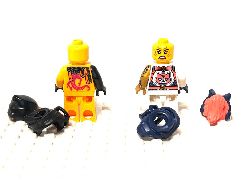 Côté ninjas on a Lloyd et Nya avec leurs masques intégraux. Les visages ont une double expression et les tampographies sont magnifiques des pieds à la tête (comme d’habitude dans cette gamme). On a aussi Sora et Arin. Là aussi les impressions sont top, jusqu’au bras gauche de Sora. Étonnamment Arin n’a pas de double expression et ce n’est pas son couvre chef qui pourrait expliquer ce choix. Bizarre…