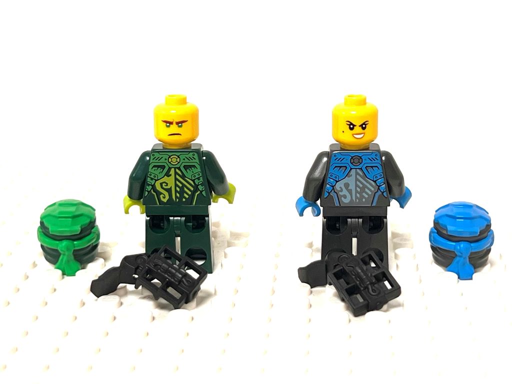 Côté ninjas on a Lloyd et Nya avec leurs masques intégraux. Les visages ont une double expression et les tampographies sont magnifiques des pieds à la tête (comme d’habitude dans cette gamme). On a aussi Sora et Arin. Là aussi les impressions sont top, jusqu’au bras gauche de Sora. Étonnamment Arin n’a pas de double expression et ce n’est pas son couvre chef qui pourrait expliquer ce choix. Bizarre…
