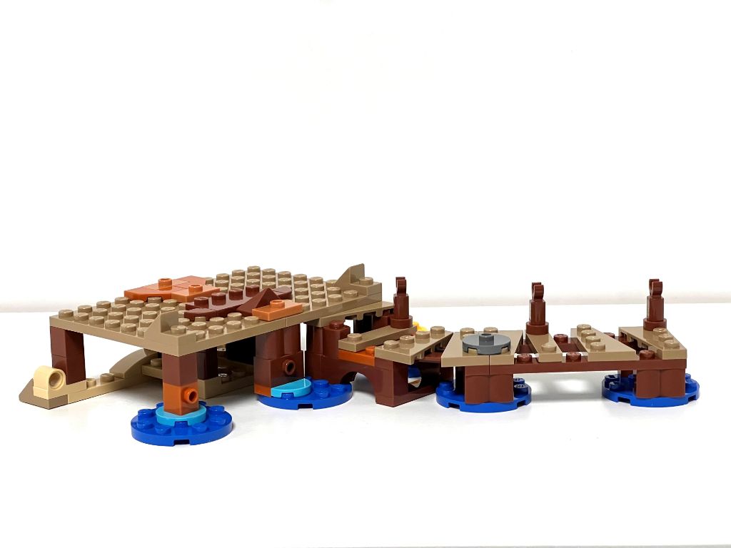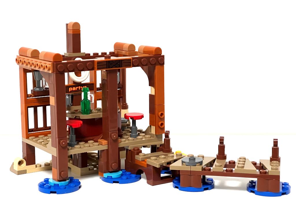 Il était évident qu’avec 300 pièces on n’allait pas obtenir un bar à la mesure de ce que l’on voit dans la série. Mais on retrouve certaines références et décorations notamment l’enseigne « partys ». On obtient malgré tout une jolie petite hutte sur pilotis.