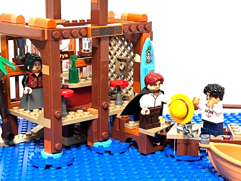 Evidemment on peut rejouer la scène de Luffy dévorant le fruit du dragon ou bien Shanks transmettant le chapeau de paille. Il y a bien quelques accessoires pour raconter une histoire autour du comptoir de la hutte mais il n’y a aucune fonctionnalité particulière hormis la possibilité de retirer le toit et le mur…