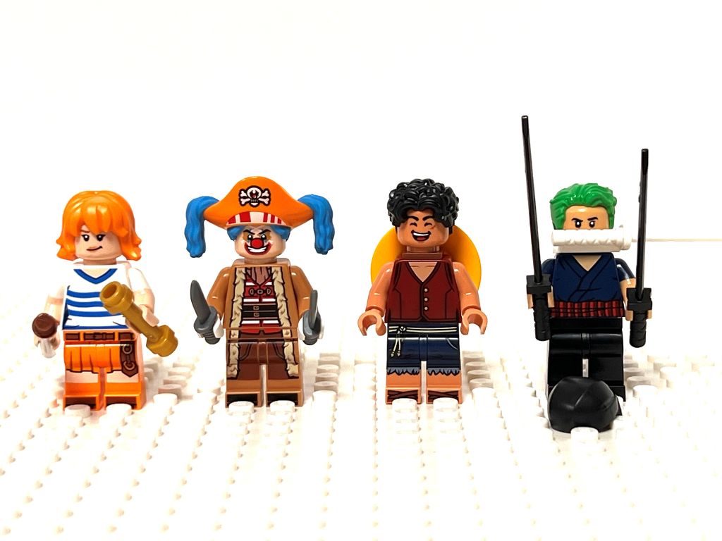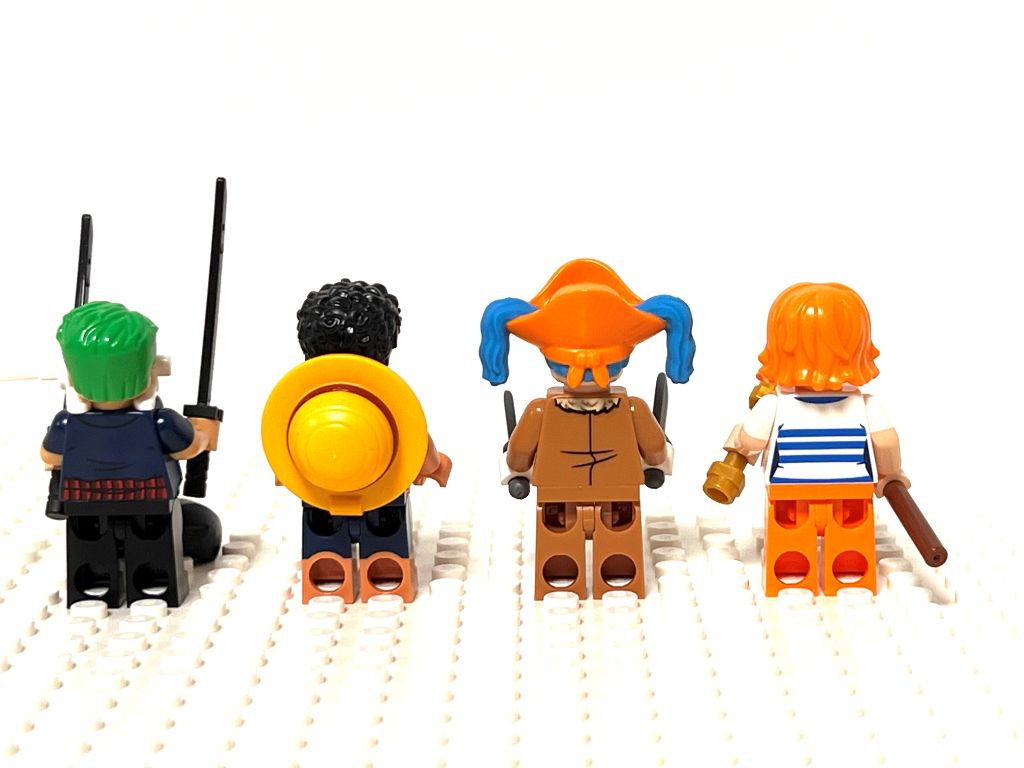 Toutes les minifigs ont torse & jambes tampographiés (sauf Zoro avec pantalon uni) ainsi qu’une tête à double expression. Elles sont magnifiques et proposent quelques accessoires bien sympas.